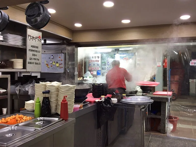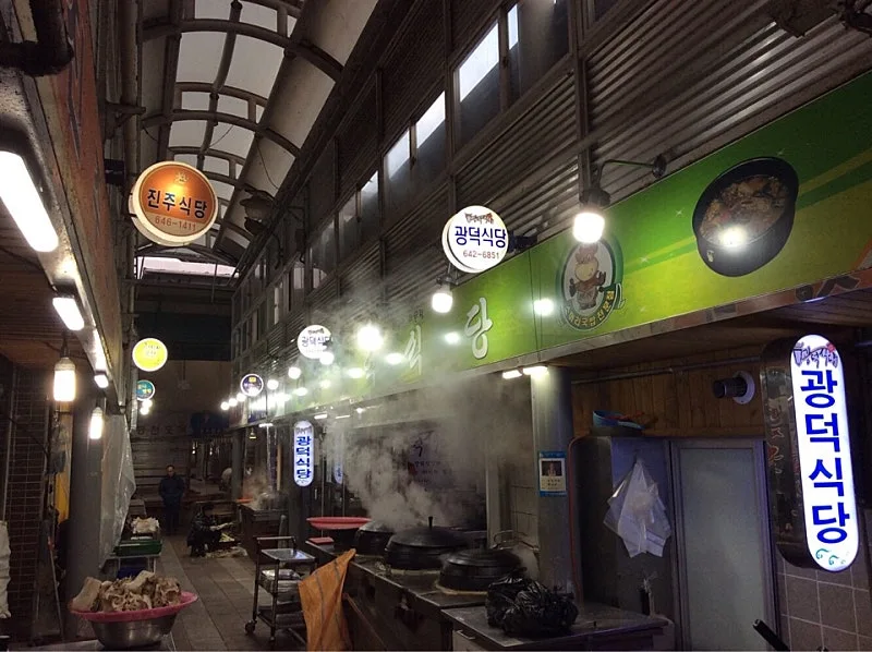 강릉 중앙시장 소머리국밥 골목 광덕식당을 찾아간다. 가게 앞에 다다른다. 입구 옆에 늘어선 검은 가마솥에서 하얀 김이 피어오른다.