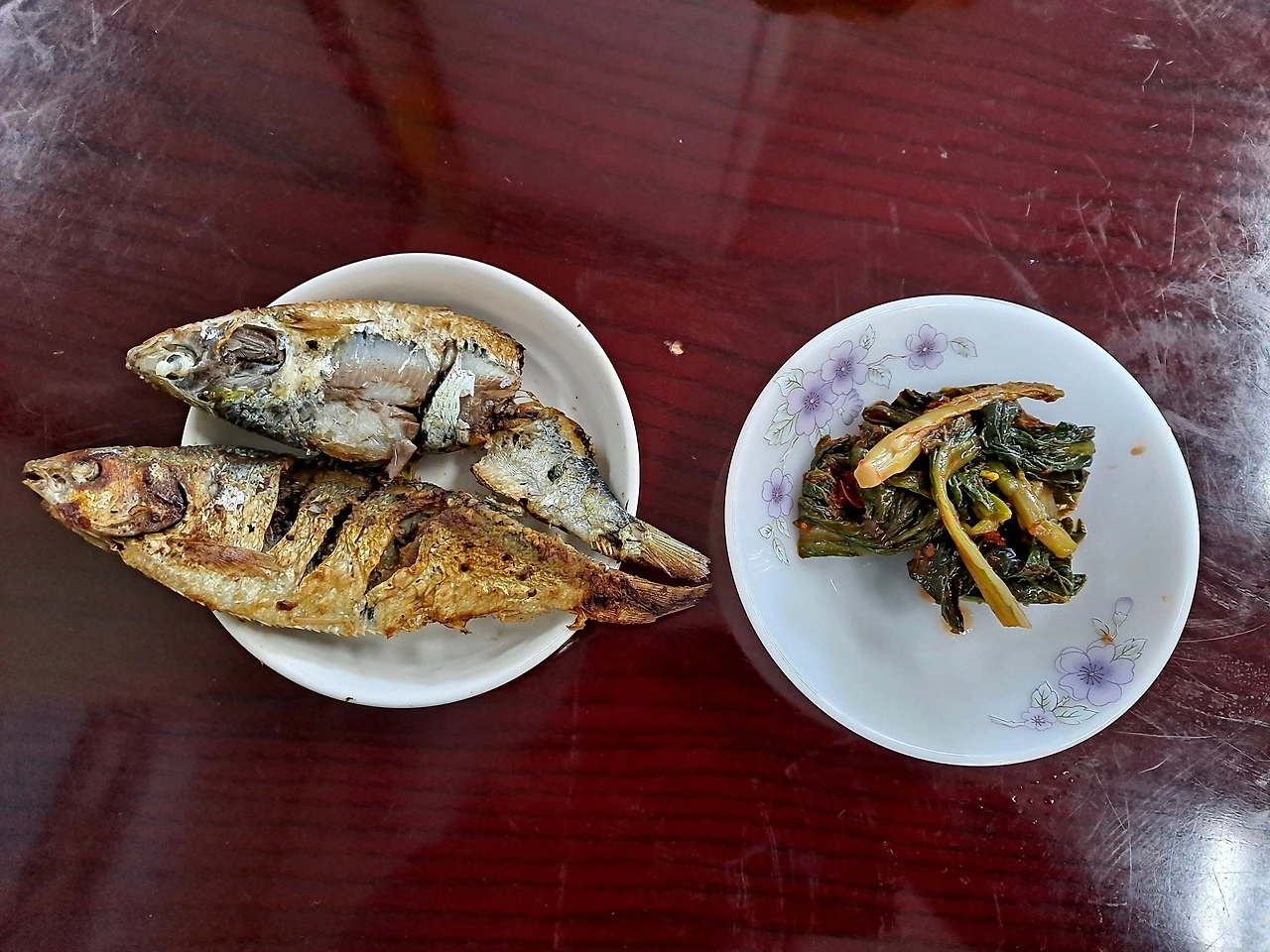 조금 시장 수품어물상회에서 산 참돔을 여사장님에게 드린다. 참돔회와 구이 등에 제철 식자재로 만든 밑반찬과 김국을 곁들여 내준다. 주위를 보니 간단한 안주나 밑반찬에 술 한잔하시는 현지 손님들도 계신다.