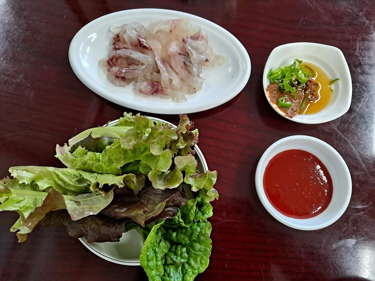 싱싱한 참돔 활어회에 된장·청양고추·참기름을 두른 쌈장, 초고추장, 상추 등과 내주며 먼저 맛보라고 한다. 한 접시 더 나온 회는 옆자리 손님들에게 드린다.