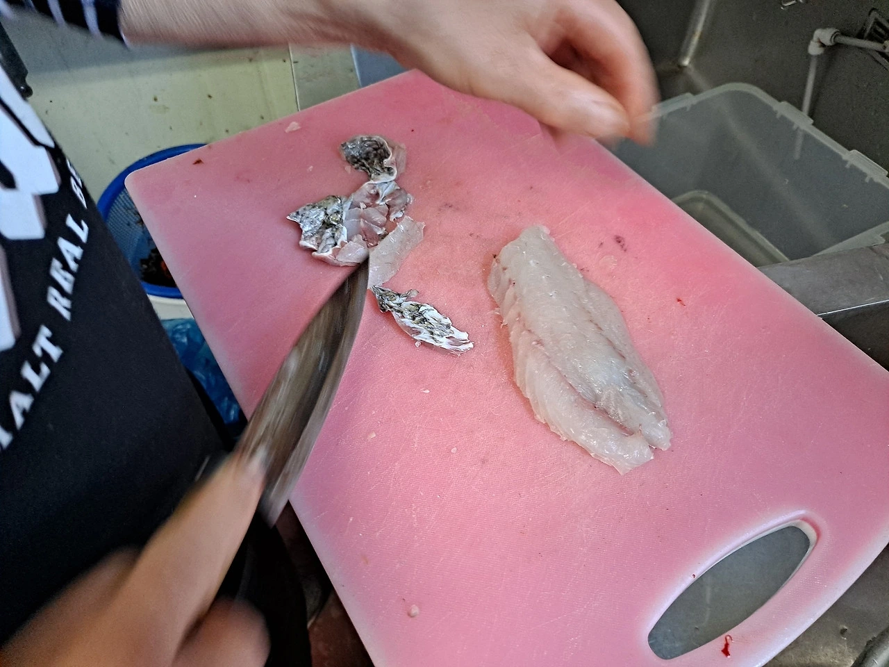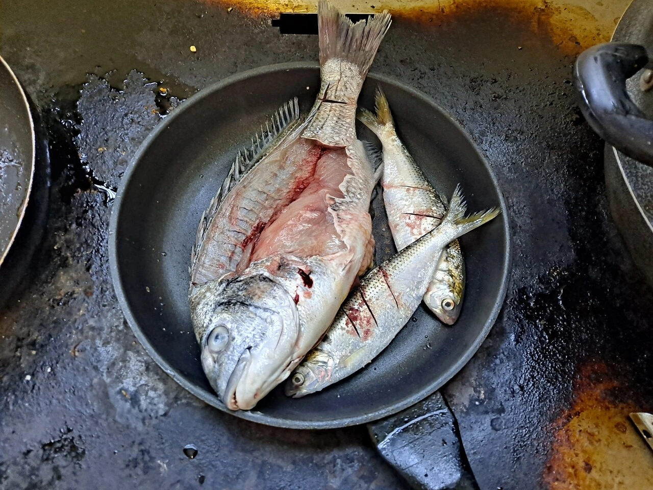 참돔구이를 주문했는데 여사장님이 하도 싱싱해 보인다며 일부분을 회를 떠 준다. 회 뜨는 일 많지 않은데, 자꾸 하다 보니 실력이 늘었다고 한다. 덕분에 활어회도 맛보고 구이도 맛본다. 회 뜬 참돔과 칼집 넣은 전어는 굵은 소금을 뿌린 후 통째로 기름 두른 프라이팬에 굽는다.