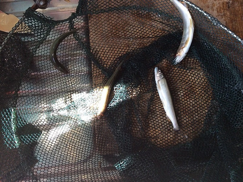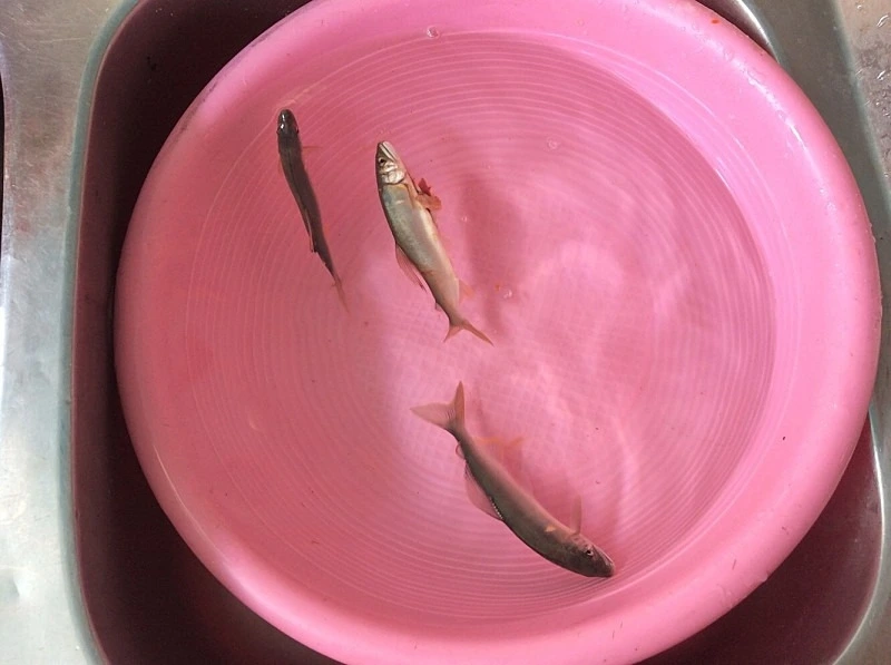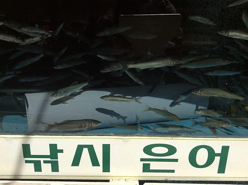 수족관 속 아직 씨알이 굵지 않은 왕피천에서 낚시로 잡은 자연산 은어들이 보인다. 여주인장이 싱싱한 은어를 꺼내 손질한다. 내장이 꺼내져도 살아 음직인다.