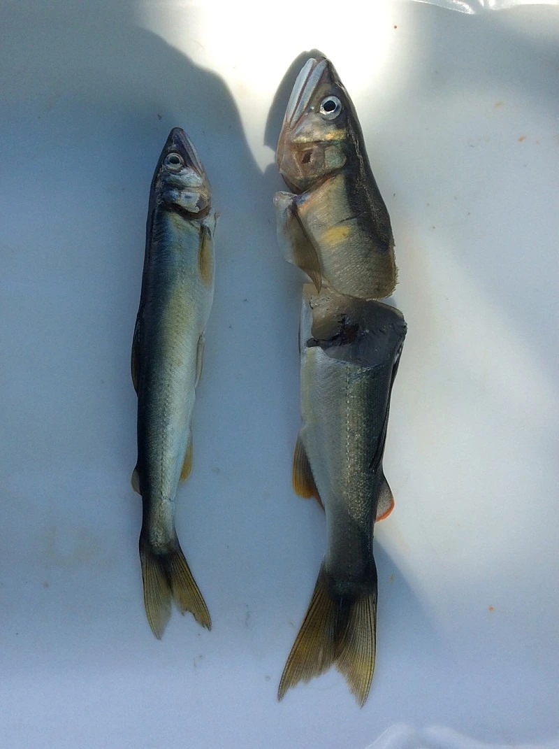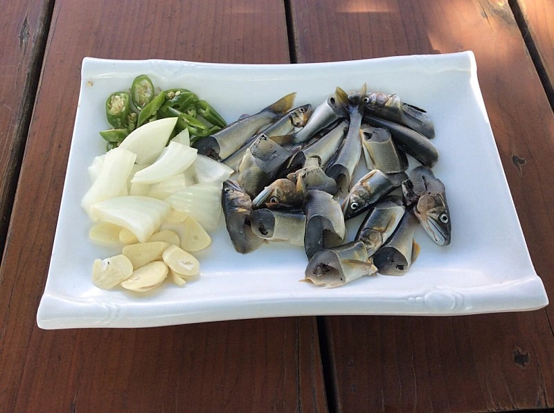 은어회는 왕피천에서 낚시로 잡은 싱싱한 자연산 은어를 내장만 제거하고 씨알에 따라 2~3토막으로 썰어 준다.