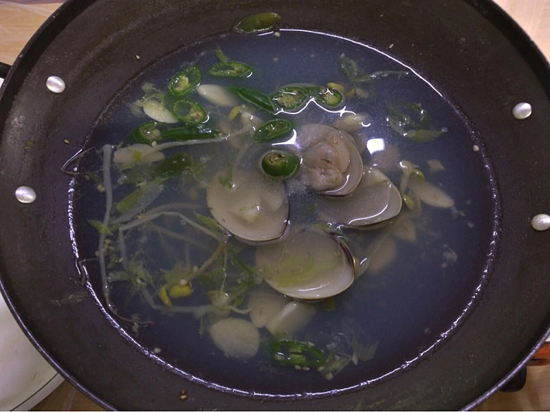 대합탕은 냄비에 물과 바지락을 넣고 끓인 후 조개들이 입을 열기 시작하면 소금으로 간을 한다. 마무리로 청양고추와 썬 대파를 얹는다. 모든 조리가 끝났다. 단순한 조리법이지만 맛은 극대화되어 있다.
