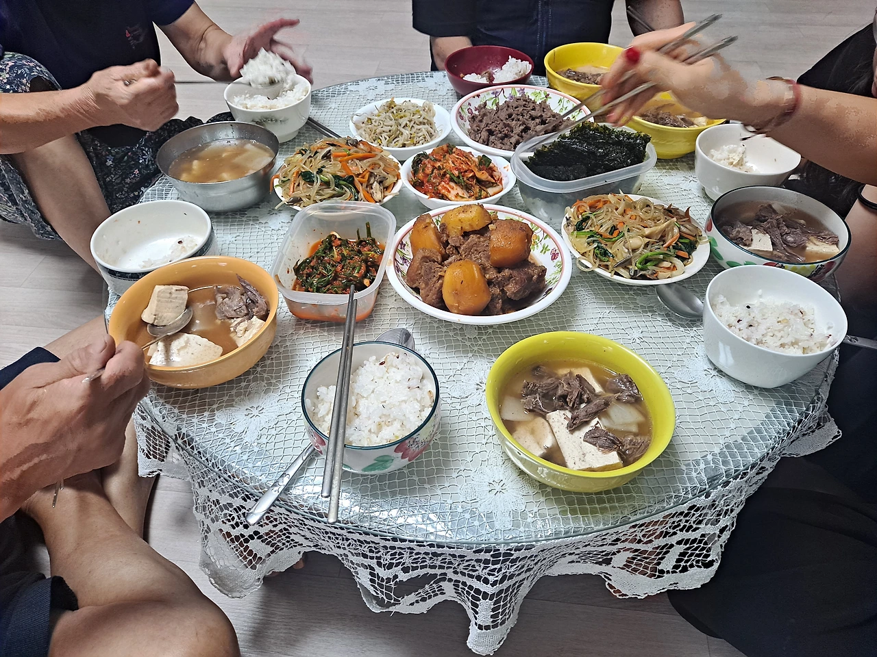 부모님, 남동생네 가족과 둘러앉아 함께 먹는다. 년에 몇 번 먹지 못하는 어머니의 두레 밥상이다.