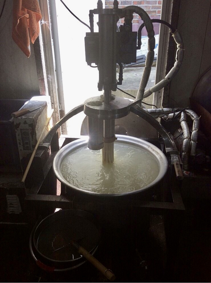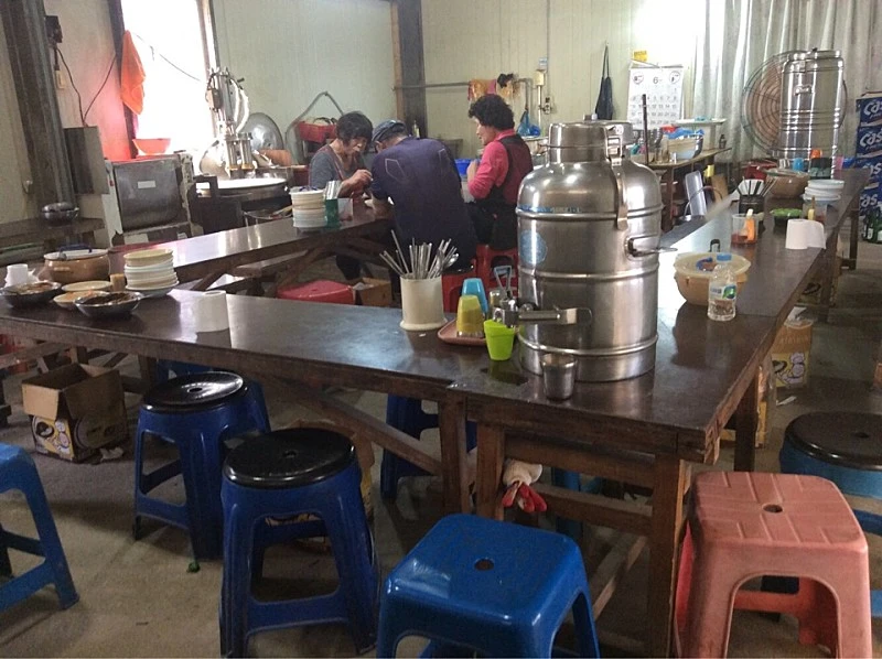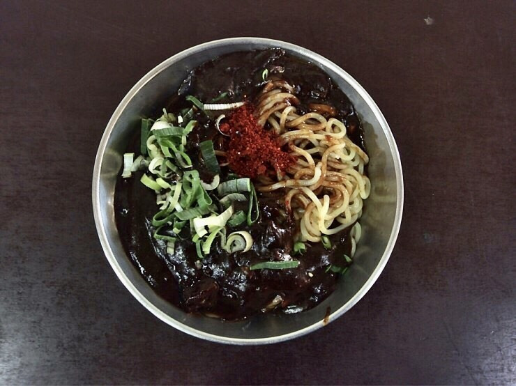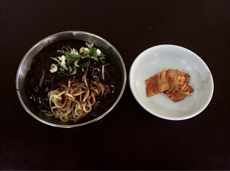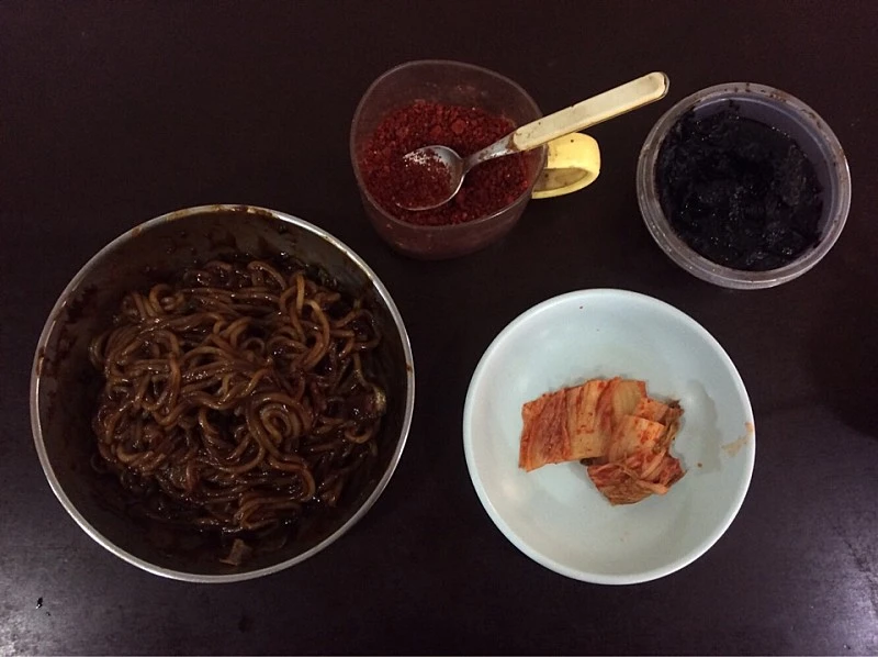 짜장면을 주문한다. 기계에 치댄 밀가루 반죽을 유압식 제면기에 넣어 면을 뽑고 끓는 물에 삶아 낸다. 찬물로 한번 헹궈낸 매끈한 면 위에 검은색 짜장 양념을 붓고 대파를 얹어 내준다. 밑반찬은 시쿰한 묵은김치 하나지만 단무지와 양파가 생각나지 않는다. 탁자에는 고춧가루통과 춘장이 담긴 통이 있다. 기호에 맞게 넣어서 먹으면 된다.