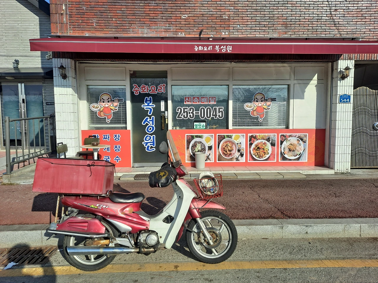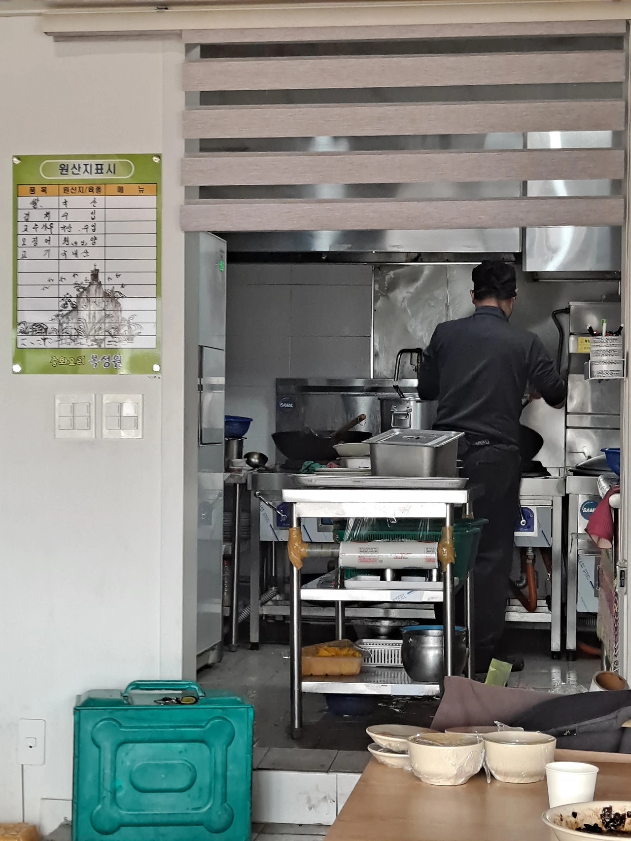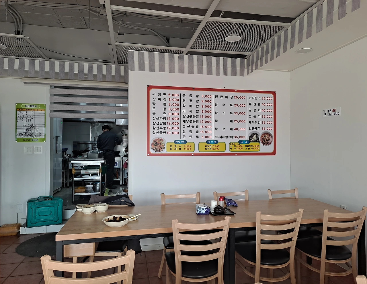 주위를 살펴본다. 남자 손님 한 분이 짜장면을 먹고 계신다. 4인용 탁자 6개가 놓인 작은 공간 앞으로 열린 주방이 보인다.
