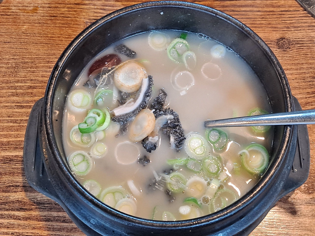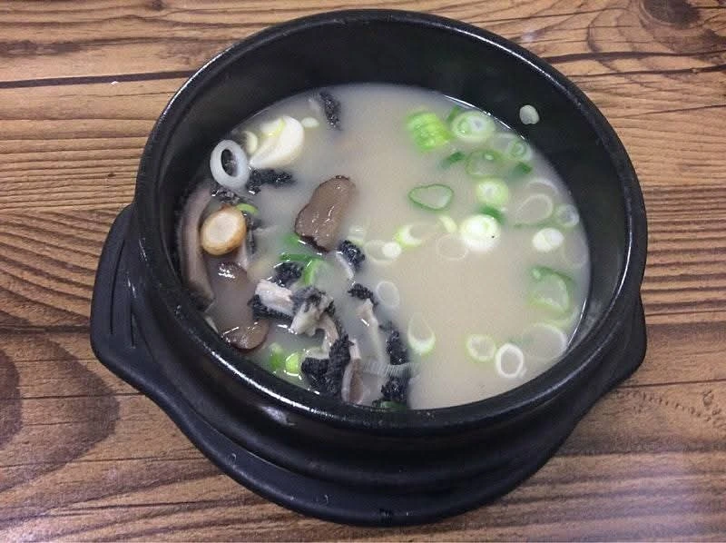 연한 갈색의 한방 양삼탕 국물을 호호 불어 맛본다. 삼삼하다.