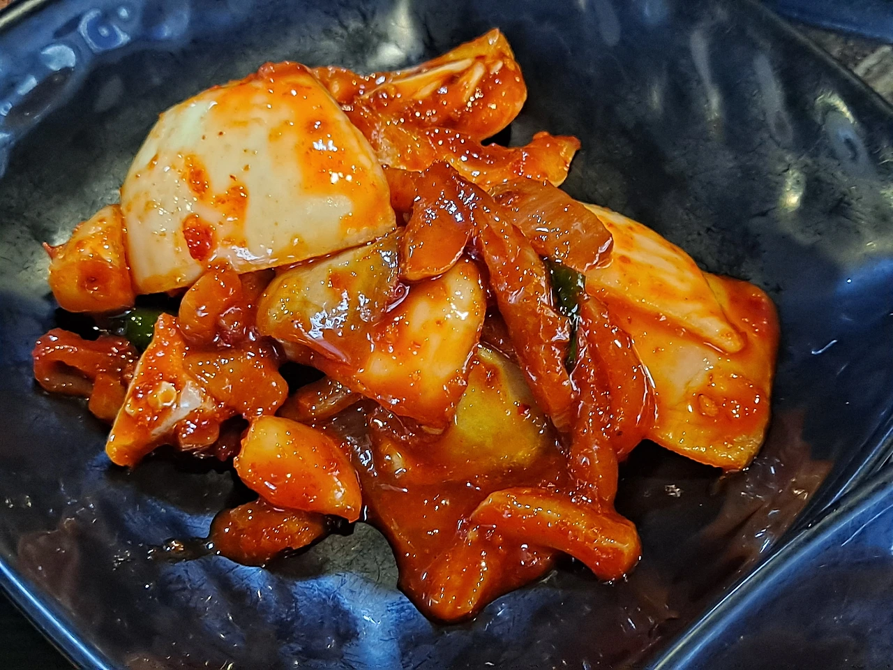 오징어젓에 신선한 양파, 매운 맛 적은 고추 등을 넣어 무친 양념 오징어젓은 쫀득한 오징어젓의 감칠맛에 달금한 양파가 시원하게 씹힌다. 맵지 않은 고추도 제 식감을 낸다.