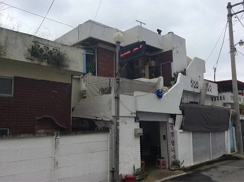 주택 골목 오른쪽으로 들어 가라는 표지판 하나만 있었고 건물에는 식당 간판 대신 조명판에 식당 정보만 흐르고 있었다.
