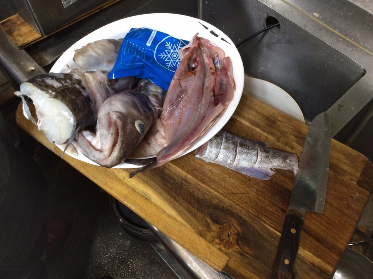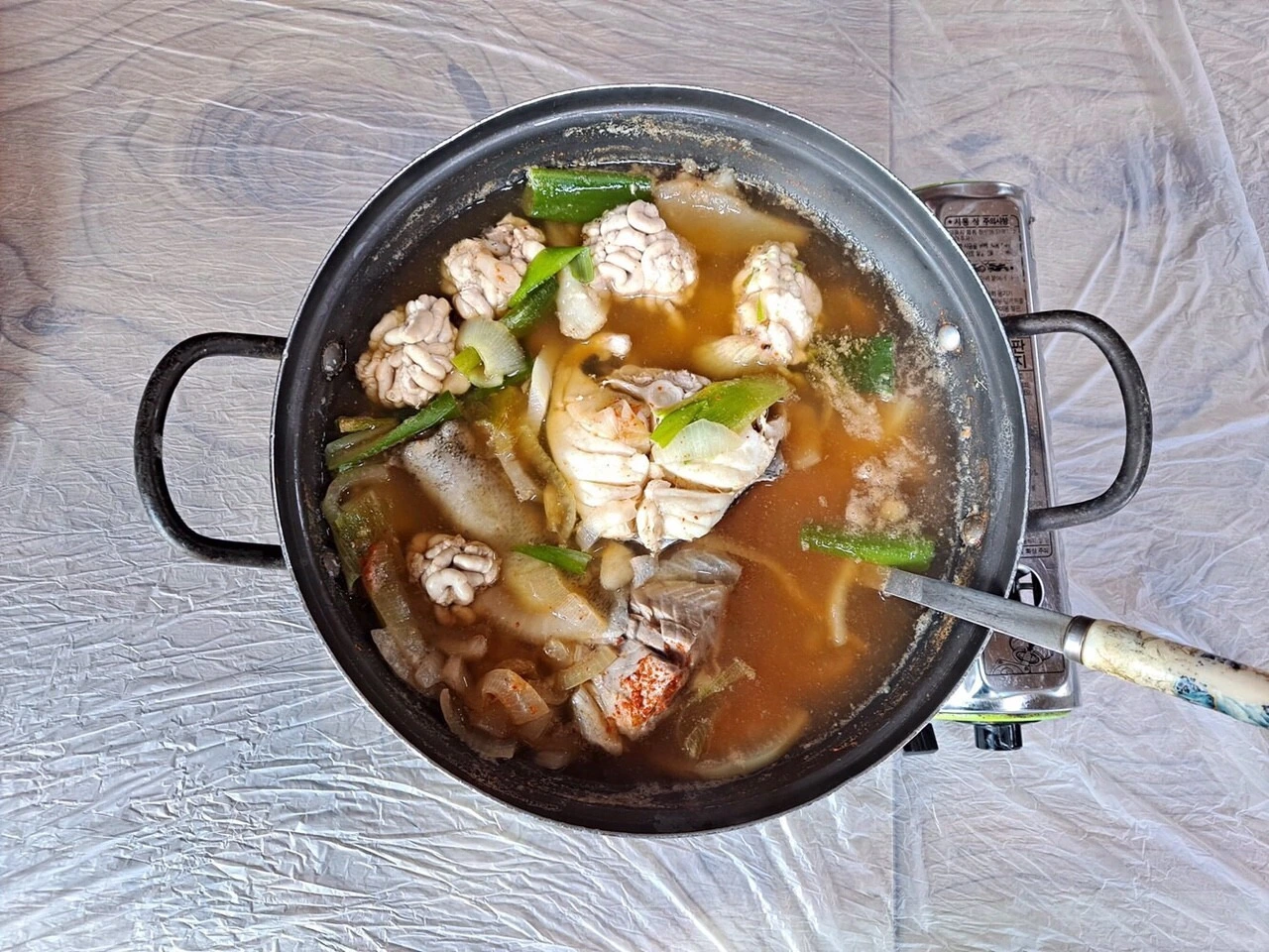 대구탕은 넓적한 냄비에 손질한 대구의 몸통, 꼬리, 이리와 듬성듬성 썬 무, 대파, 양파 등 채소를 넣어 끓인다.