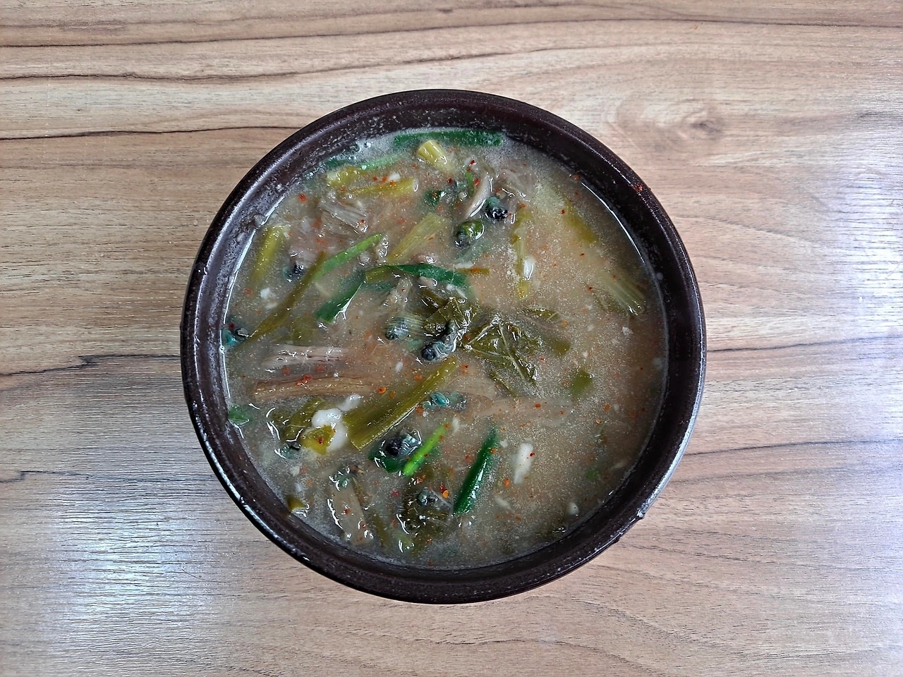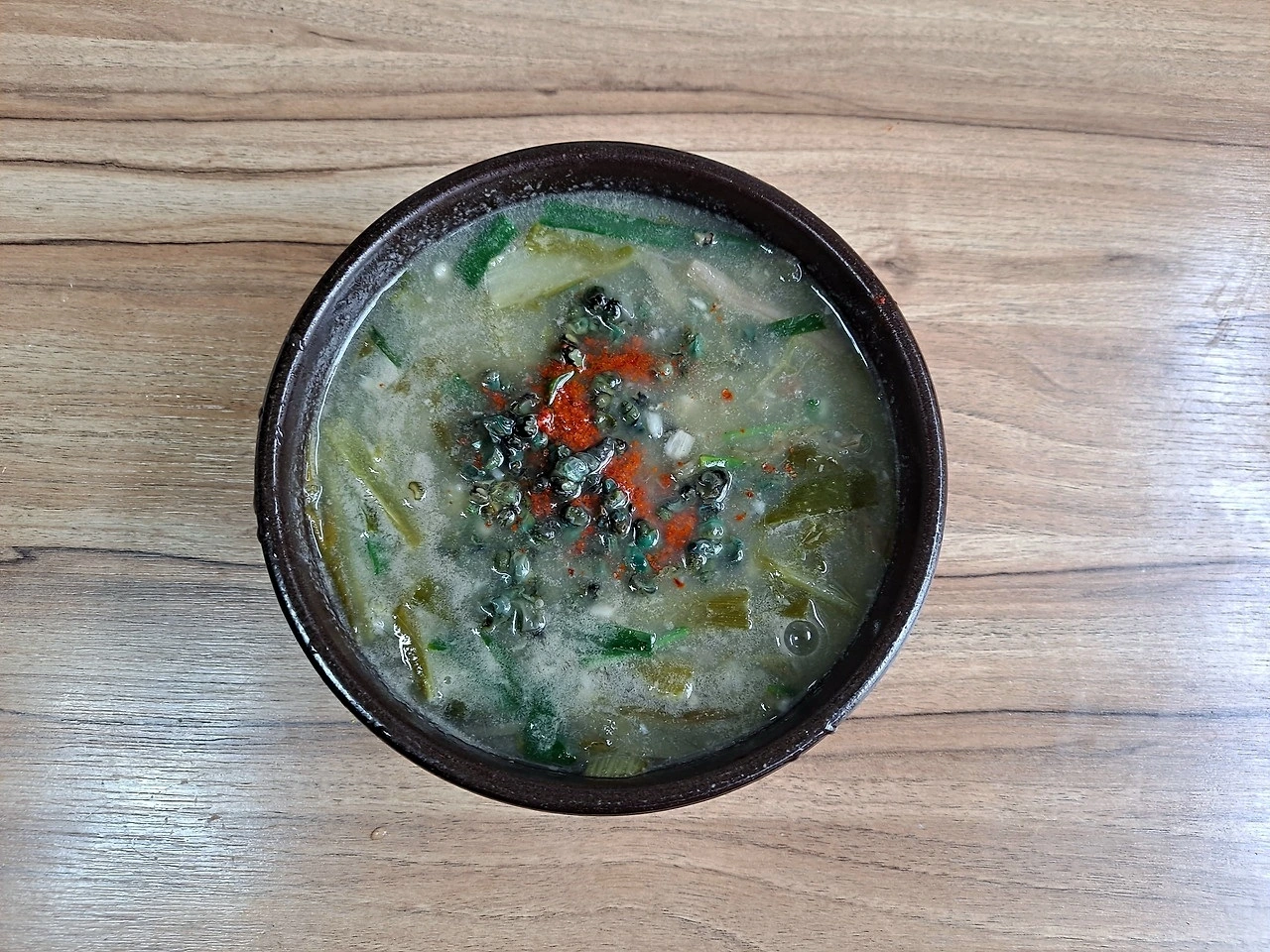 작지만 존득하게 씹히는 다슬기와 부드럽게 씹히는 채소 건더기가 푸짐하다. 청양고추를 넣고 다진양념을 풀면 얼큰하고 칼칼한 맛이 더해지지만, 국물 본연의 맛은 해하지 않는다.
