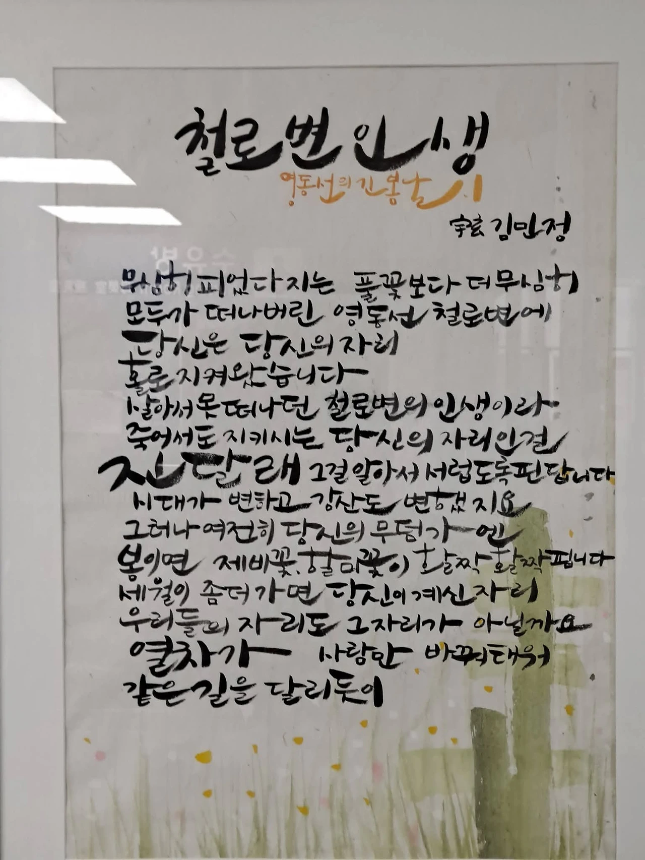 태백역 안에는 우현 김민정 시조시인의 시 「철로변 인생 - 영동선의 긴 봄날 1」이 걸려 있다. 나는 그 시를 읽으며 여행을 마무리한다.