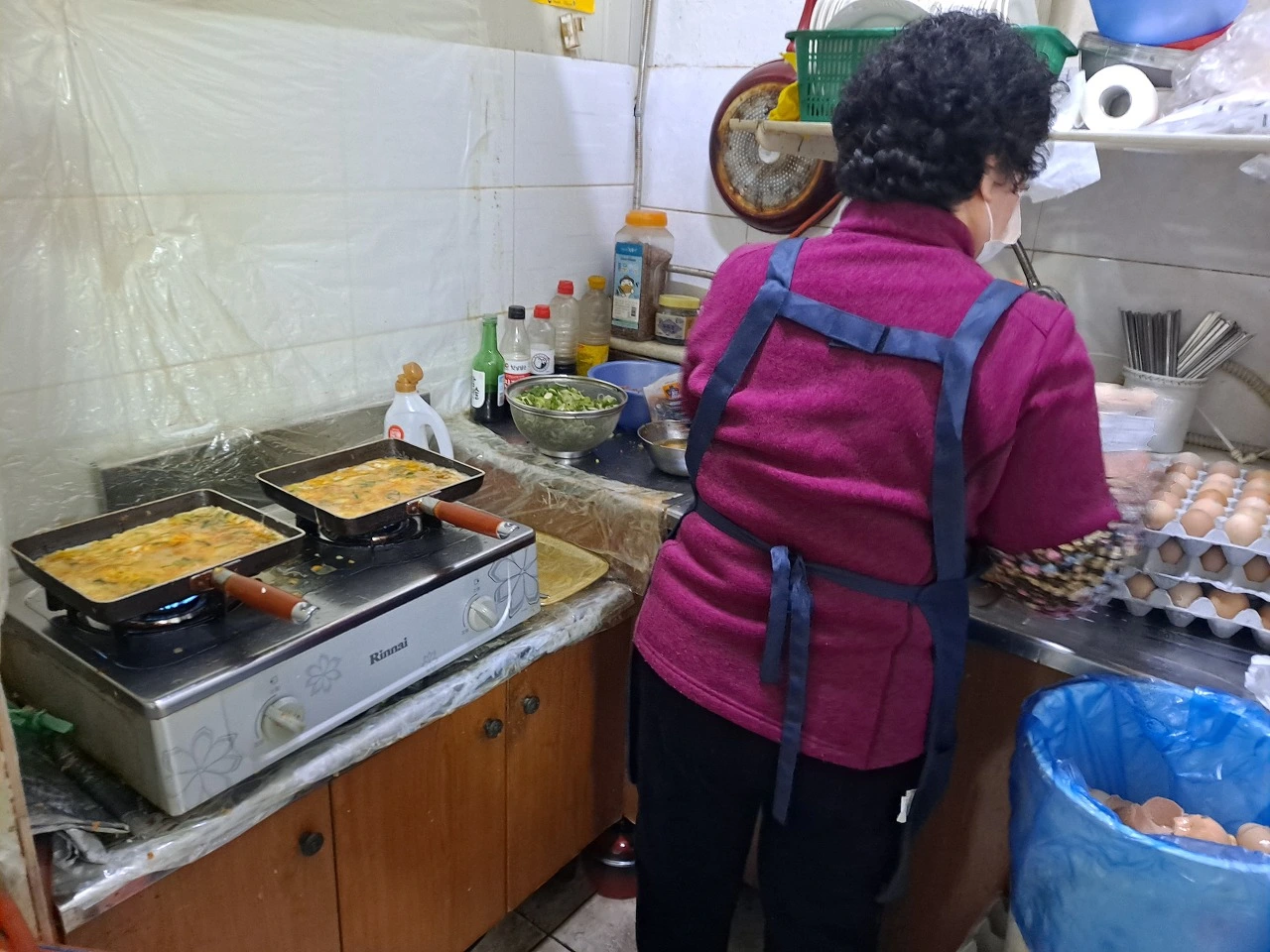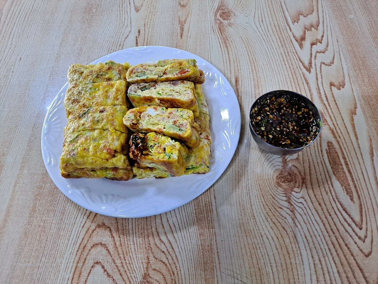 계란말이는 주문하면 즉석에서 말아낸다. 달걀 물에 잘게 다진 당근, 파, 햄 등을 넣고 소금간하여 프라이팬에 기름을 두르고 서서히 익혀가며 둥글게 말아낸다. 도톰하게 말아낸 계란말이를 먹기 좋은 크기로 썰어 하얀 접시에 담아 내준다. 하얀색, 노란색, 분홍색, 파란색이 어우러지며 눈맛을 자극한다.