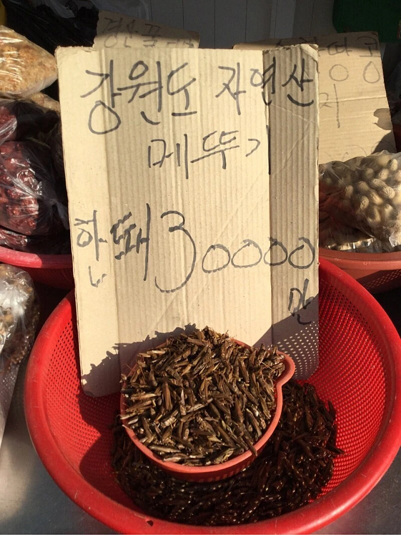 일전에 보리밥을 맛나게 먹은 강릉 식당 앞에서 말린 메뚜기를 본 기억을 찾아 다시 들렸다. 여사장님께 메뚜기 있는지 여쭤본다. 강릉 지인분이 유기농 논에서 직접 잡아서 준다는 자연산 메뚜기를 제철엔 말린 걸 판매하며 나머진 냉동 보관해 둔다고 하며 보여준다.