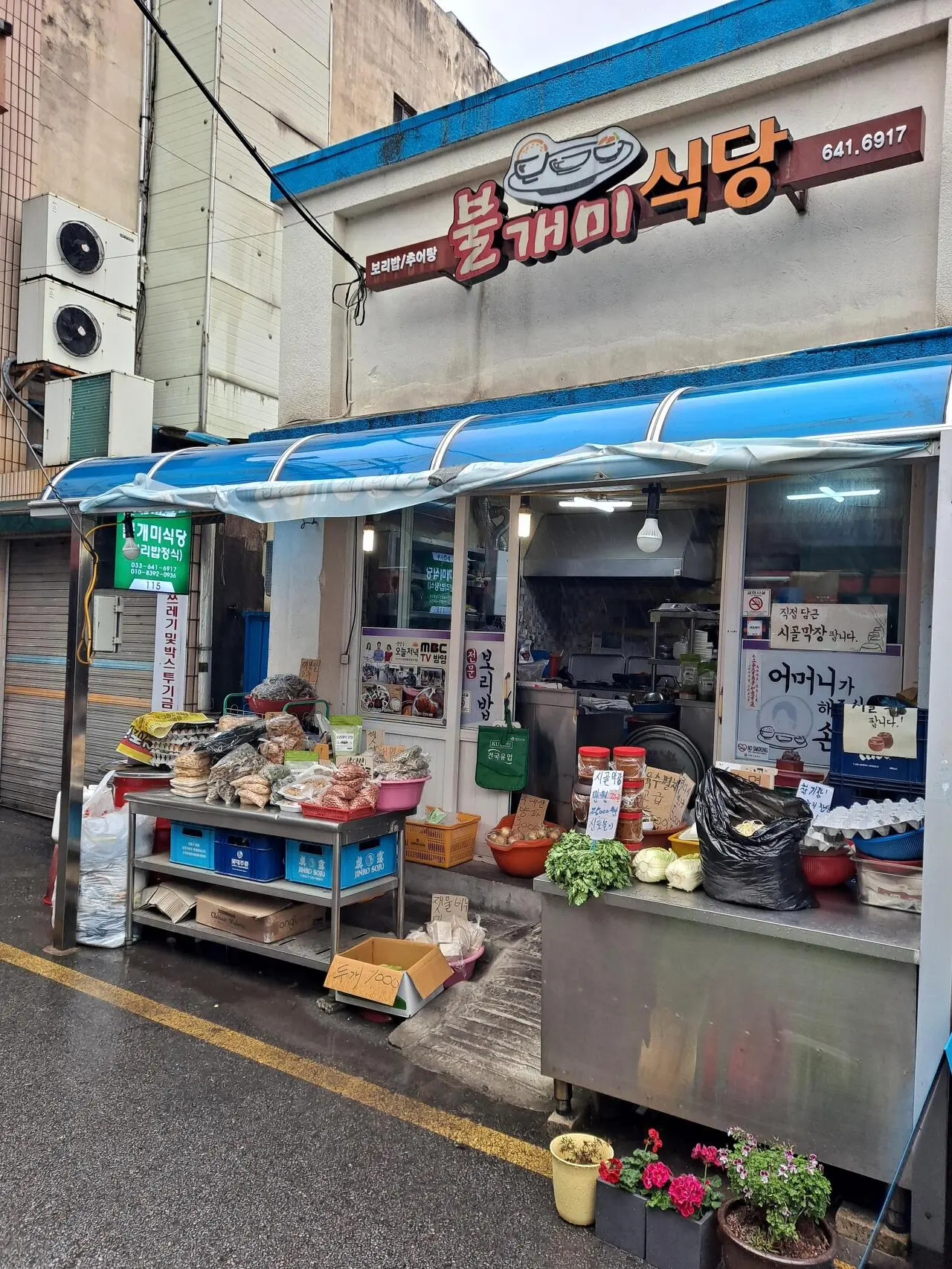 불개미식당은 강릉중앙시장 부근에 있는 보리밥집이다. 입심 좋고 푸근한 인상의 중년 여사장님이 운영한다. 30여 년 가까이 영업 중이다. 가게 앞 진열대에, 지역에서 나는 식재료도 판매한다. 자연산 메뚜기가 눈에 띈다.