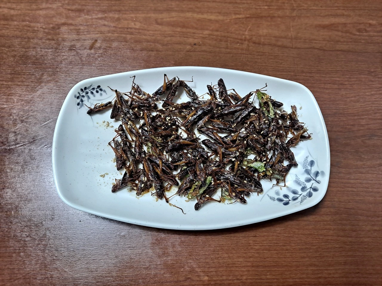 여사장님이 메뚜기볶음에 채 썬 청양고추를 넣어서도 내준다. 통통한 메뚜기 맛을 본다. 바싹하게 씹히는 식감이 그만이다. 짭짤하면서도 고소한 맛에 청양고추의 맵고 칼칼한 맛이 더해져 입안이 흐뭇해진다. 메뚜기 잡던 동심(童心)으로 이끄는 추억의 맛이다.