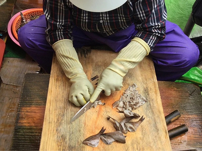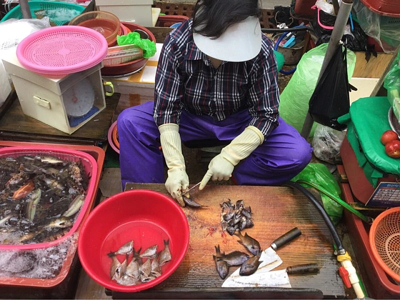 다인밥상에서 양해 구하고 먹으려고 자리돔회를 주문한다. 여사장님이 뼈가 억세지 않은 크기의 활어 자리돔을 골라 소쿠리에 담는다. 소쿠리 속 자리돔을 건져 비늘을 긁어내고 머리와 지느러미, 내장을 제거하는 여사장님 칼질이 능숙하다.