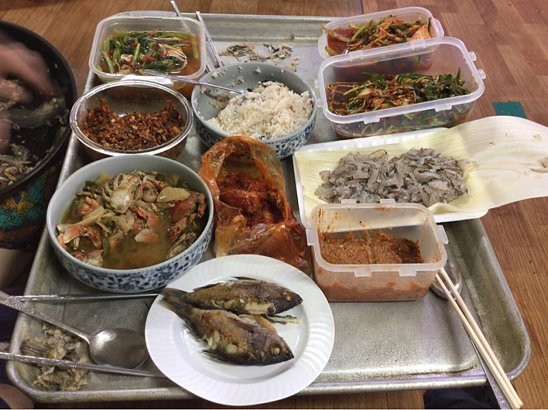 수저를 받고 식사하시는 쟁반을 본다. 된장, 무, 채소, 게, 방아잎을 넣어 끓인 구수하고 시원한 게 장국과 볼락구이, 견과류 듬뿍 넣은 멸치볶음, 열무물김치, 열무김치, 부추김치, 쪽파김치, 자리돔회 찍어 먹을 구수한 된장 등 밑반찬과 콩을 넣어 지은 밥이 빛바랜 네모난 쟁반에 차려져 있다.