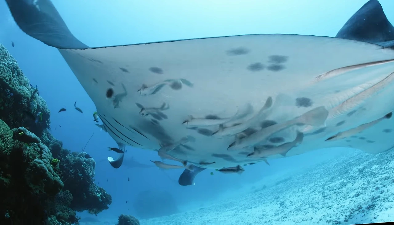 저렇게 큰 입속으로 고래처럼 모든 물고기들을 꿀꺽 삼켜버릴 것만 같은데 또 배 아래에 작은 물고기들이 바짝 붙어 다니는 모습이 인상적이었다. 마치 코뿔소와 코뿔소새처럼 공생하는 모습이다. 만타의 희고 커다란 배에 낀 찌꺼기를 먹으며 청소를 해주는 걸까..
