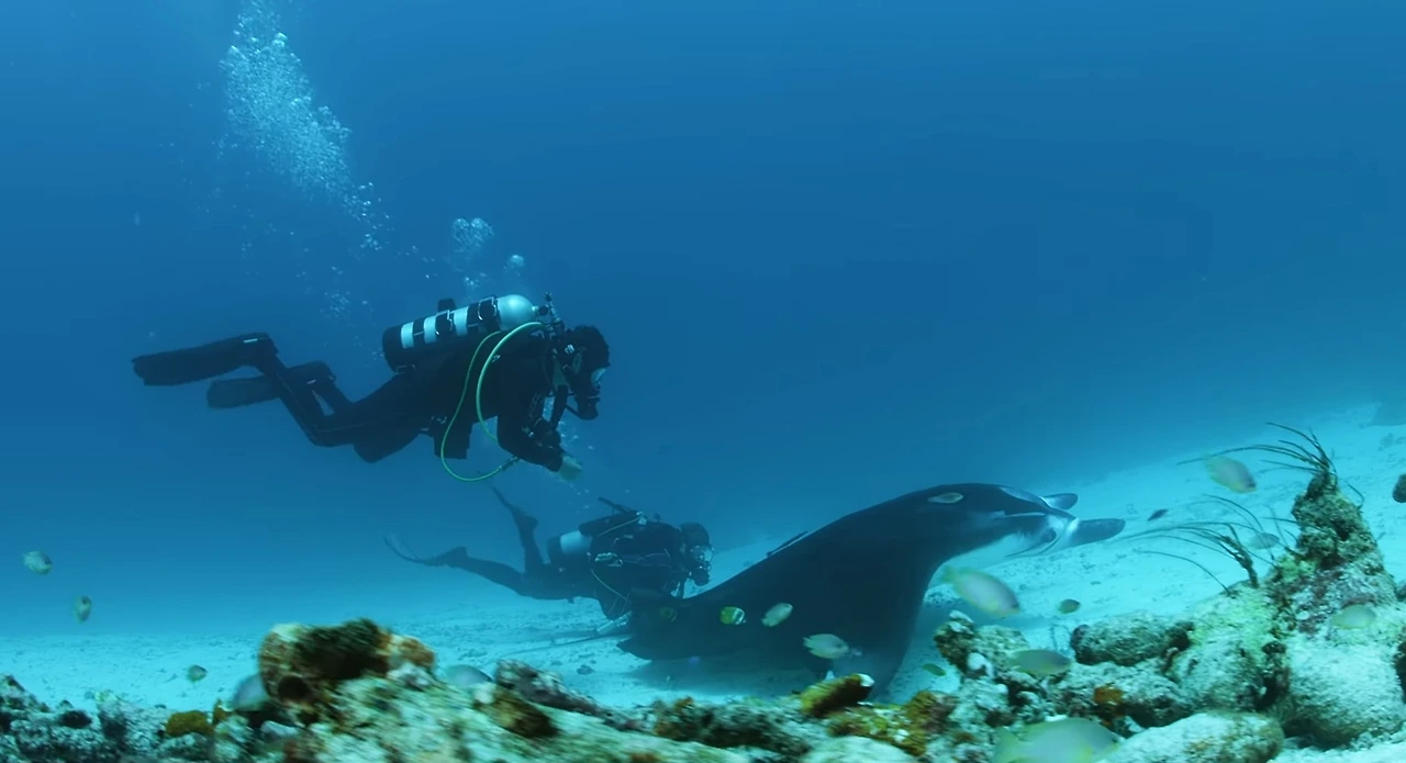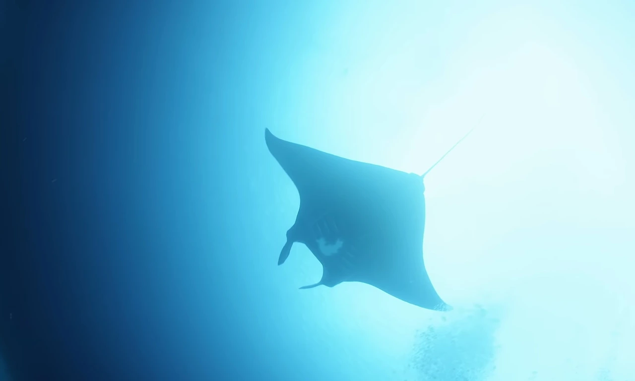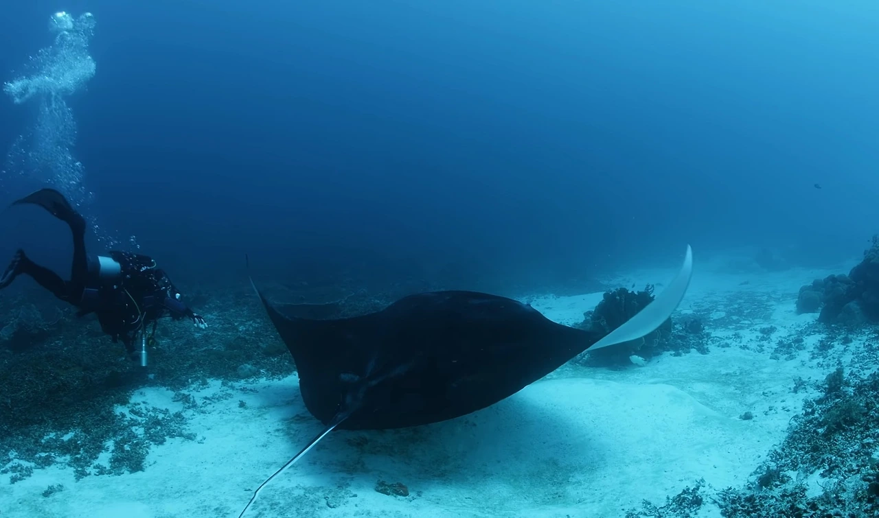 강사의 지시에 따라 앞으로 계속 나아갔다. 얼마 지나지 않아 어마한 크기의 만타 가오리네다섯 마리가 눈에 들어왔다. 만타의 배 아래에는 공생하는 작은 물고기들이 따라다녔다. 내 생애 처음 보는 거대한 만타의 모습에 압도되고 말았다. 이렇게 큰 가오리가 있다니.. 가까이 가서 보아도 위협적이지 않고 돌고래처럼 다정하게 대해주는 느낌이 들었다. 너무도 크고 두꺼운 몸체로 마치 물속에서 날아다니기라도 하듯 양쪽 날개를 위아래로 크게 움직인다.