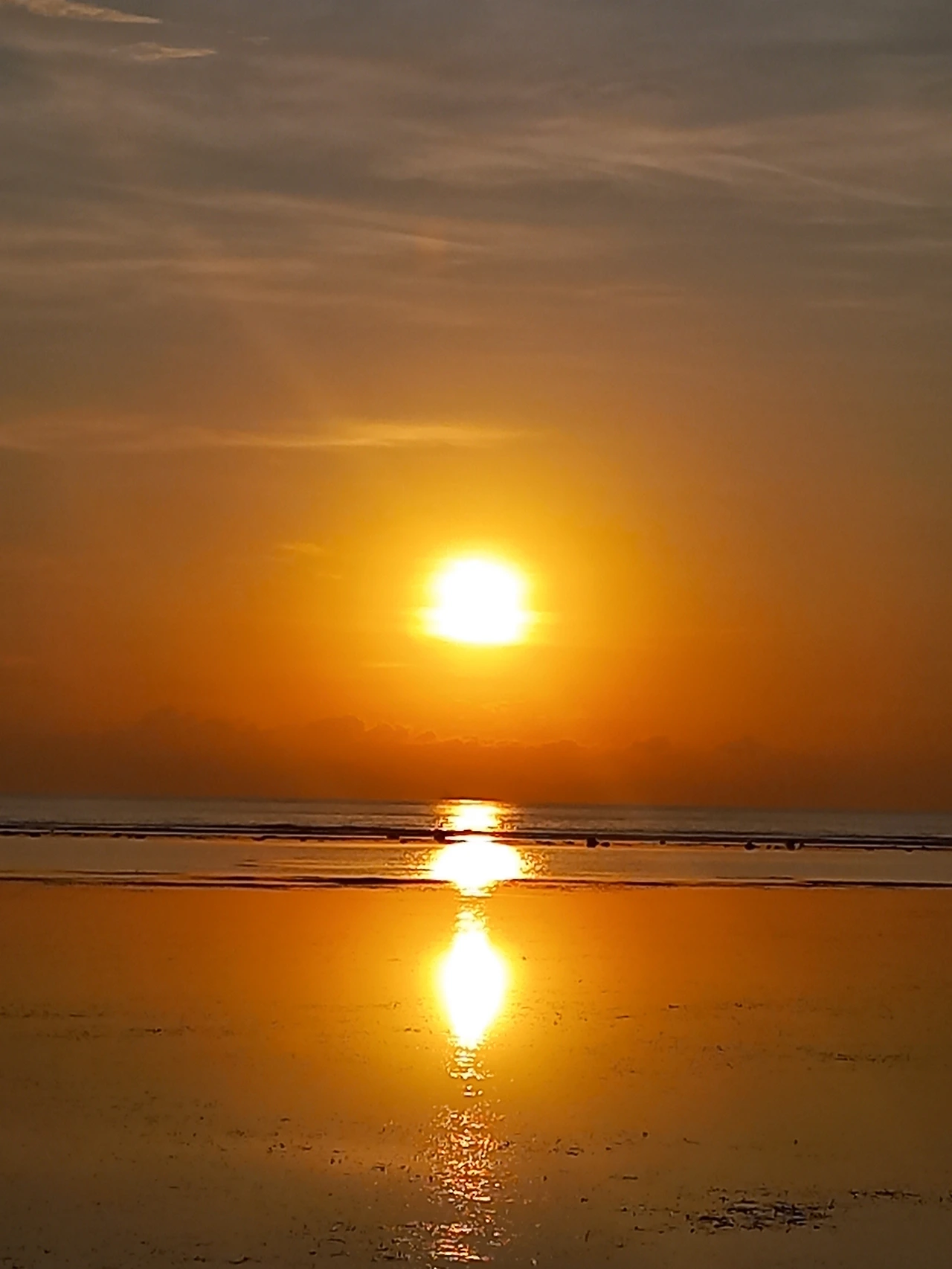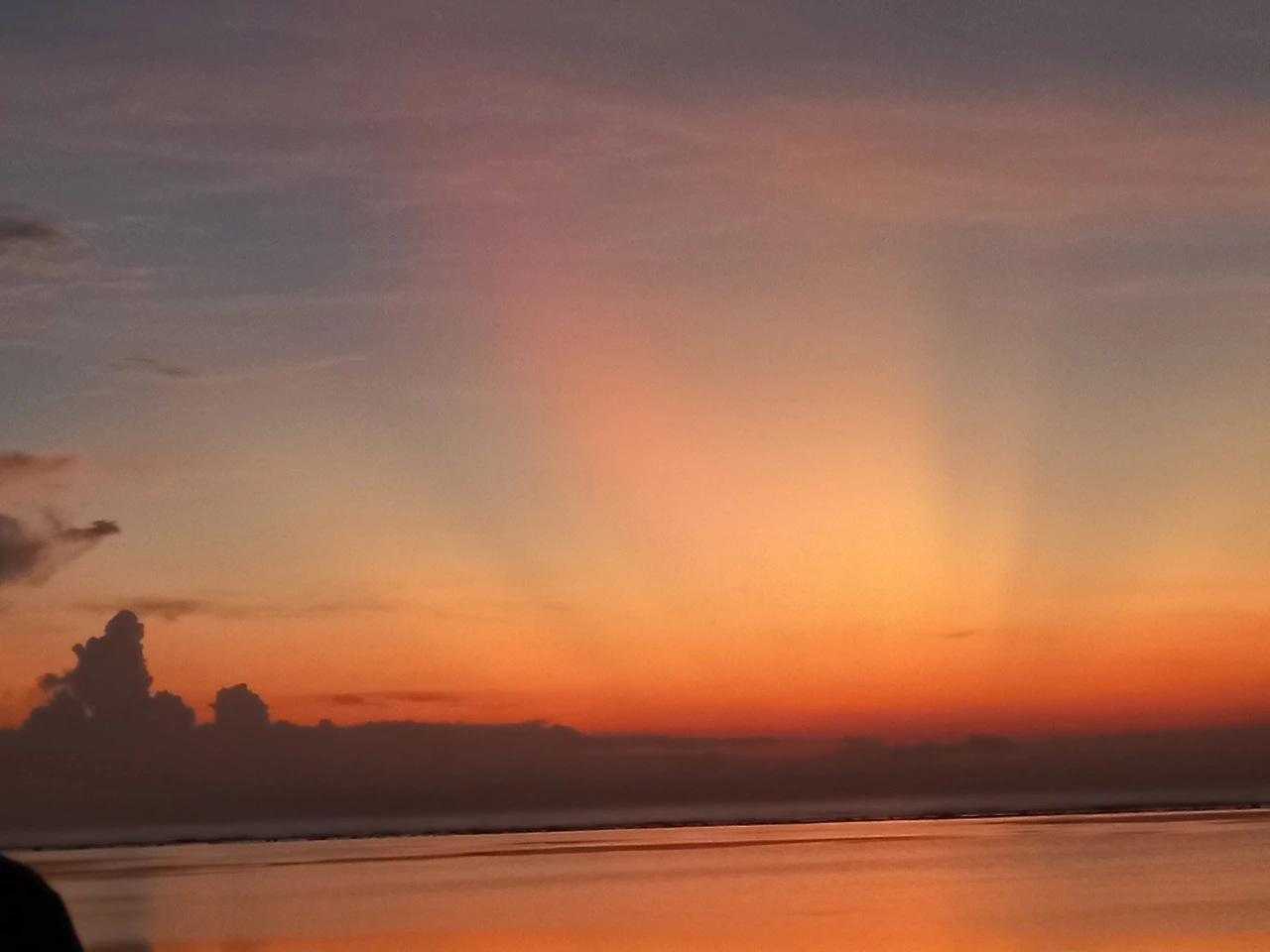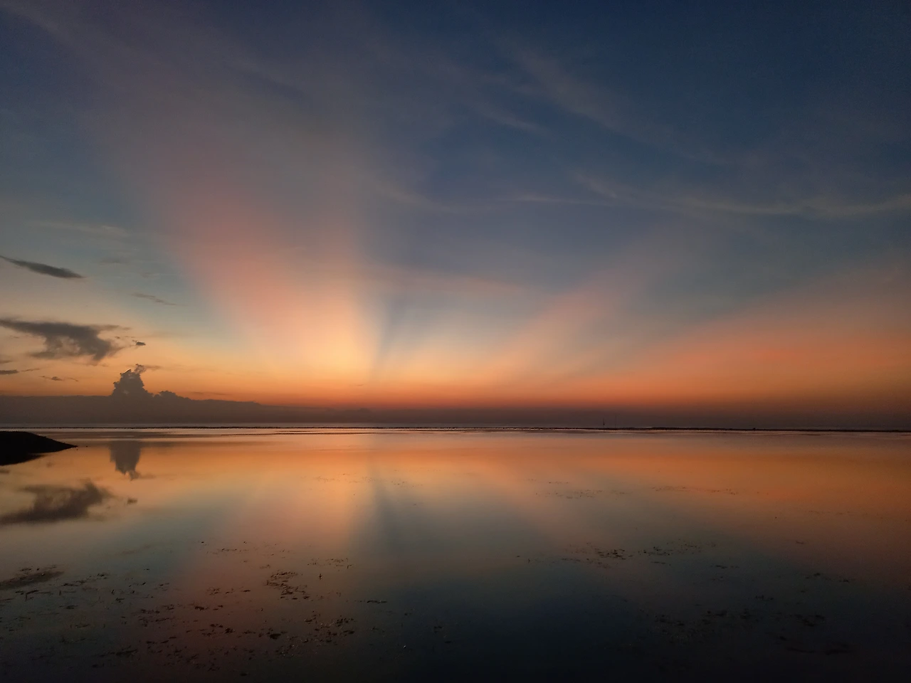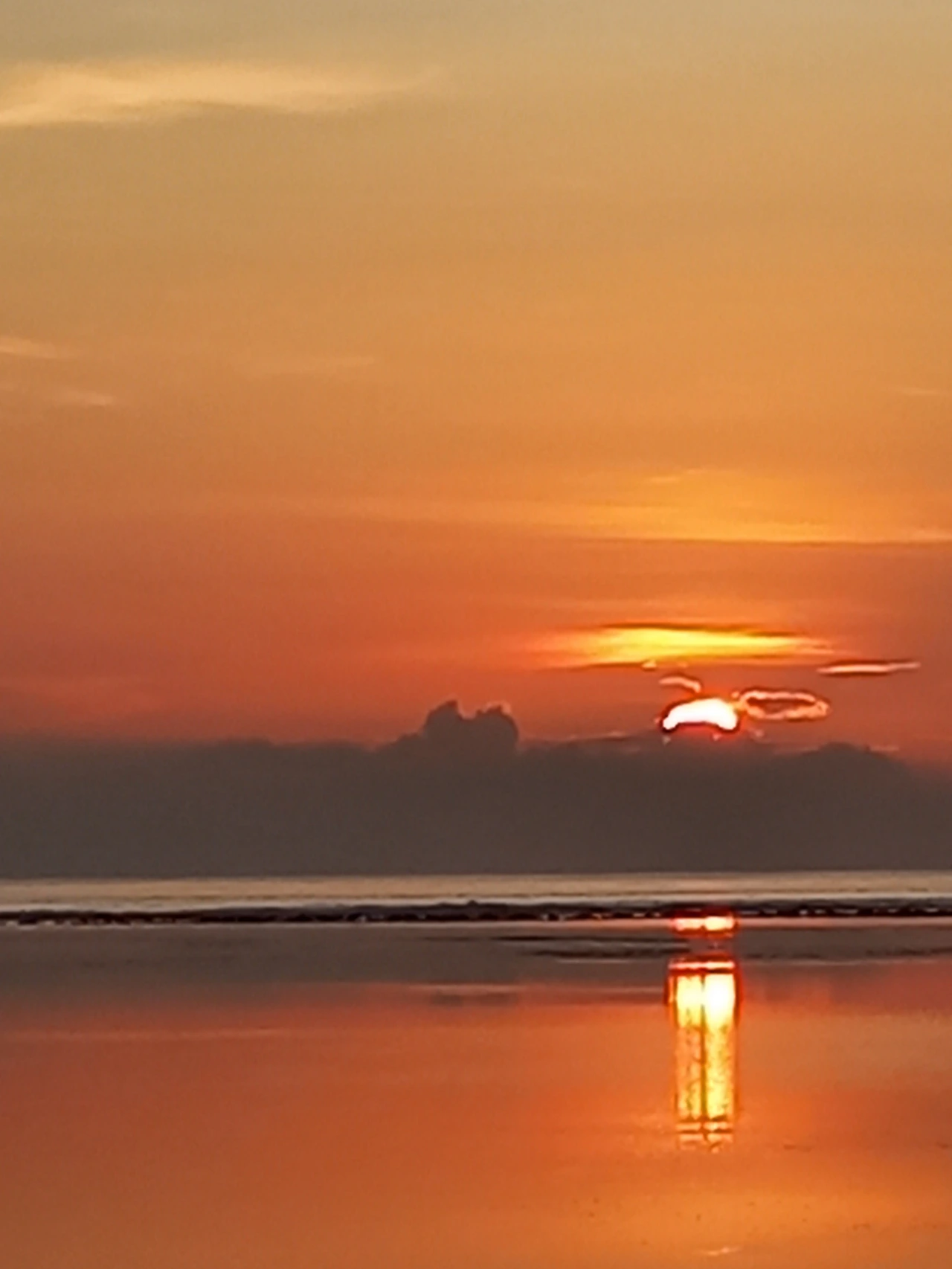 특이한 모습의 일출이 시작되었다. 해가 떠오르기 시작함과 동시에 수평선을 대칭선으로 데칼코마니 같은 모습의 신비로운 광경이 펼쳐지기 시작했다. 기능이 좋지 않은 내 휴대폰으로 발리일출의 참모습을 제대로 담아낼 수 없어 너무 아쉬울 지경이었다.