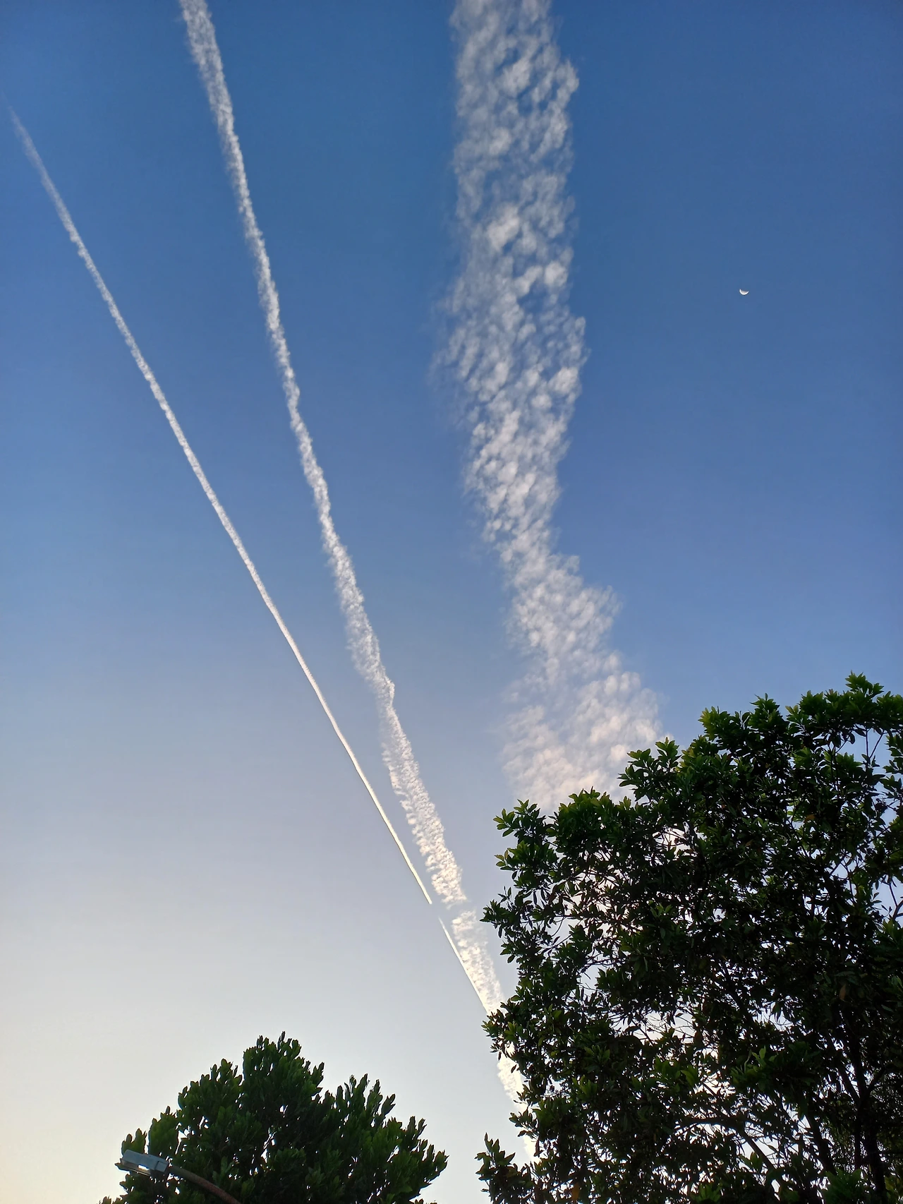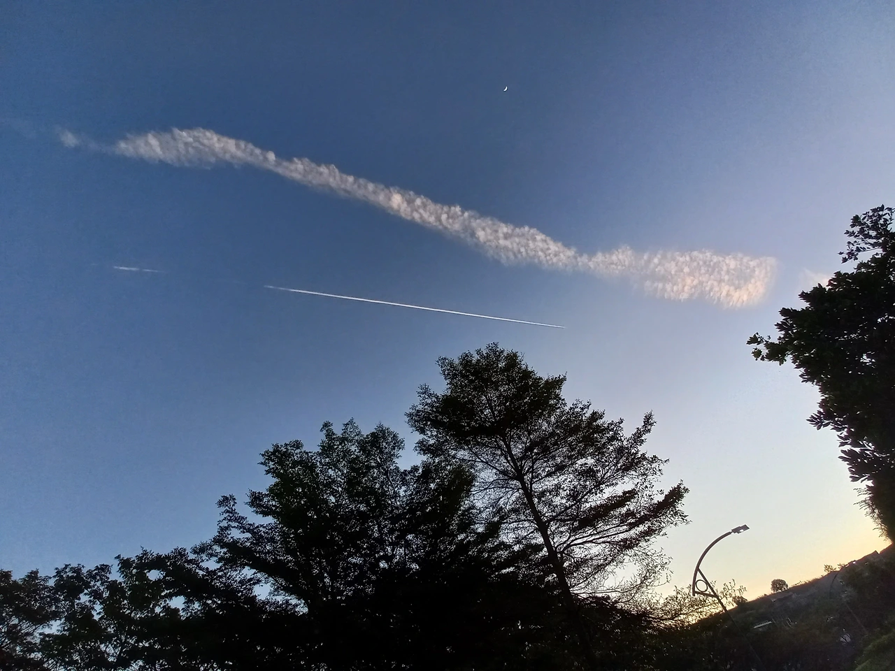 다시 8분 여가 더 지냐고 세 바퀴째, 또 처음 지점에서 하늘을 바라본다. 이게 뭐지? 넓게 퍼져가는 긴 흰색 줄 옆에 또 새로운 하나의 하얗고 긴 직선이 생겨있다. 너무 신기해서 걸음을 멈추고 자세히 하늘을 보니 지금 새로 생긴 직선은 점점 길어지고 있는 모습이 보인다. 동영상을 찍었다. 너무 높은 고도로 날아서 그런지 소리는 전혀 나지 않지만 분명히 직선의 끝에 불빛이 약하게 보인다.