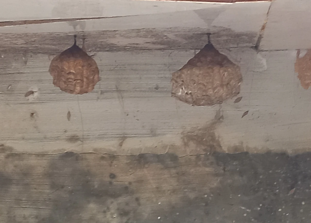 게 대롱대롱 매달려 있다. 말벌이 집을 지어 놓은 거다. 그것도 두 개나. 말벌 집 주변에 작은 벌들은 물론 성충도 몇 마리나 날고 있었다.