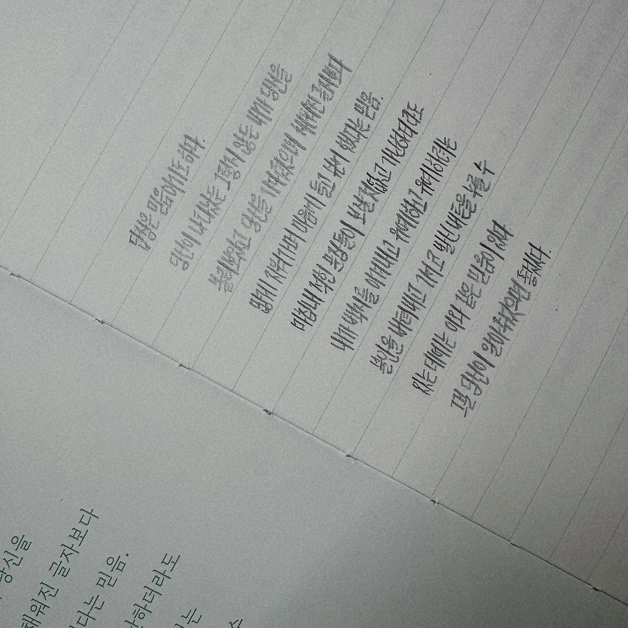 필사책에서 생겼던 또 하나의 선호가 있다. 종이의 질감. 종이의 질감에 대해 생각해본지는 그리 오래 되지 않았다. 최근에 옥스포드 노트패드에 필기를 하다가 깨달았다. 매끈한 종이 질감은 글씨게 예쁘게 써지지 않는다는 것을. 그래서 내가 선호하지 않게 될 거란 것을. 워낙 많은 글을 쓰다보니 한글자, 한글자 대단히 정성들여 쓰는 것은 아니지만, 너무 미끄러워 글씨가 휘날리는 걸 볼 때면 불편한 마음이 들기 때문에. 적어도 오래 남길 기록을 할 때만큼은 그런 질감의 종이는 피하기로 했다. 그런 생각을 했지만 그렇다고 종이의 질감을 고려해가며 노트를 고른 것은 아니었는데. 새로 시작한 필사 노트의 종이 질감이 너무 마음에 들었다. 당분간은 여기 정착해도 되겠다는 생각을 할 정도로! 그리고 필사책의 종이 질감도 딱 그런 정도였다. 아주 미끄러진 않고, 외국의 옛날 책들만큼 거칠지는 않은 적절한 정도의 거칠기. 또는 부드러움. 사각사각 연필이 오가는 느낌이 좋지만 번지지 않는 적절함을 가져 펜을 써서 쓰는 것도 나쁘지 않은 그런 질감. 종이의 코팅이 필기감에 이렇게나 많은 영향을 끼치는 지. 깨닫기 전에는 알지 못하는 것이었다.