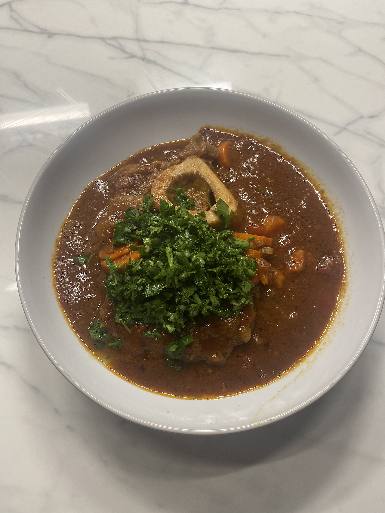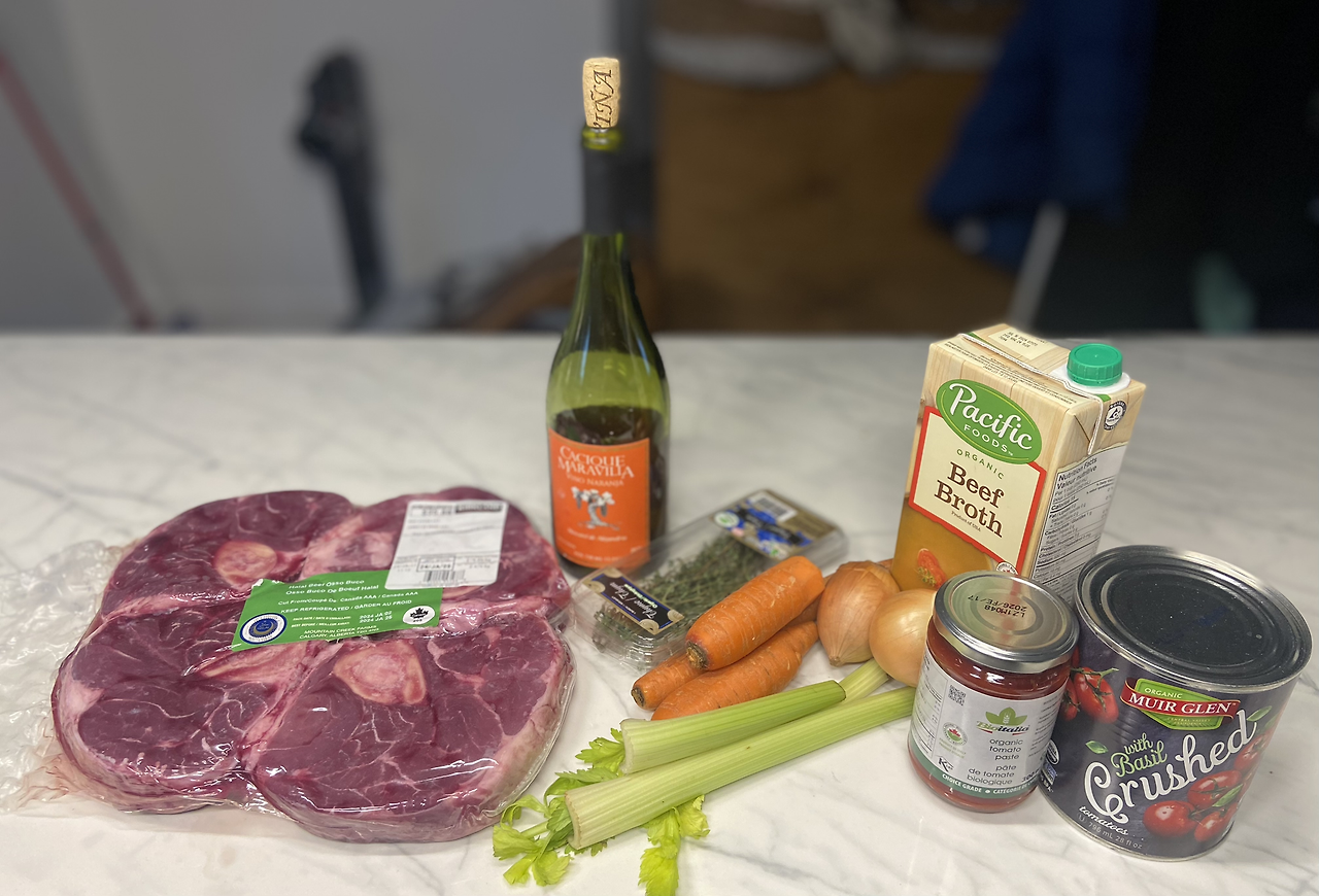 재료는 양파, 셀러리, 당근, 타임, 소고기 육수, 화이트 와인, 토마토 다진 것 캔, 토마토 페이스트, 마늘, 타임, 월계수잎, 소금, 후추, 약간의 밀가루, 그리고 고기입니다. 제가 좋아하는 레시피는 https://www.ricardocuisine.com/en/recipes/2149-osso-buco입니다. 간략하고 명료한 레시피입니다.
