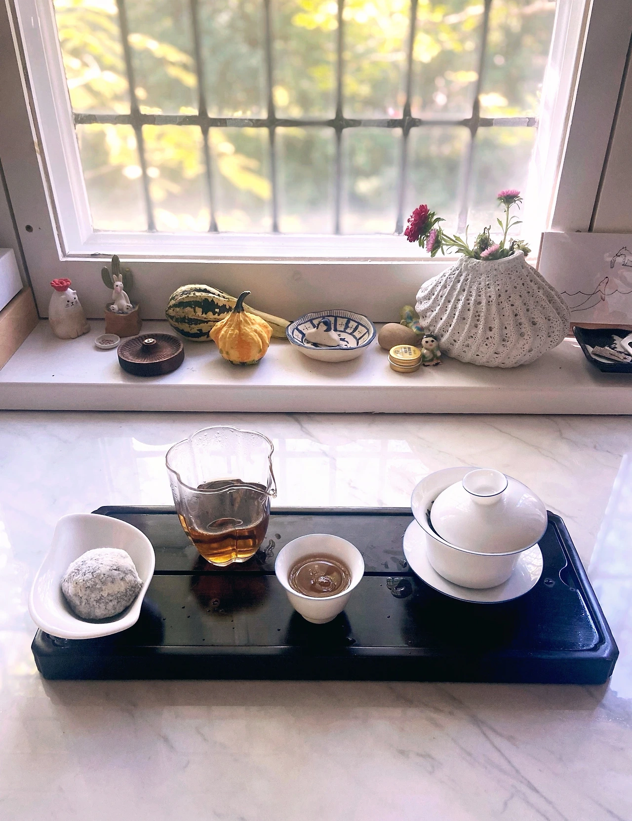 차가 다 우려 지면 늘 차를 마시는 창가로 차판째 들고 옮겨 와 머리를 비우며 차를 음미합니다. 개완이나 티팟에서 우려진 차는 공도배로 옮겨 담은 후 거기에서 작은 찻잔에 차를 따라 마시며 공도배를 다 비울 때까지 그저 차와 제자신만 있는 것처럼 찻잔을 후루룩 조금씩 조금씩 비워갑니다.