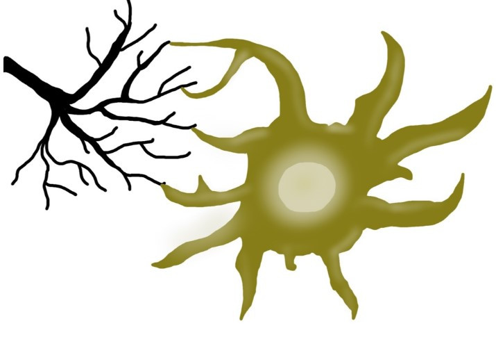 뉴런에서 밧줄마냥 길게 늘어진 부분은 ’축삭돌기‘라고 한다. 축삭돌기는 자극을 다른 뉴런과 기관으로 전달하는 역할을 한다. 즉, 신경세포체에서 받아들인 자극을 전기신호로 바꾸어 전달하기 위해 이러한 모양을 가지고 있는 것이다. (+추가하기 : 머릿속에는 이러한 뉴런 세포가 약 40억개~ 거대한 신경망으로 연결되어 있다.)이제 축삭돌기의 끝 부분을 살펴보자. 축삭돌기의 말단은 마치 나무의 뿌리처럼 여러 갈래의 돌기가 뻗어있는 모습을 볼 수 있다. 이 부분에 시냅스가 있다.