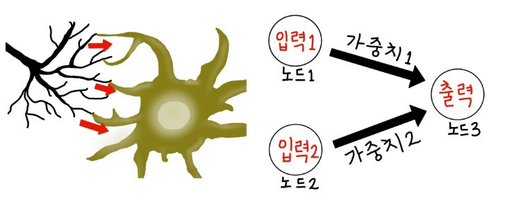 인공신경망은 인간의 뇌와 비슷한 구조를 컴퓨터에서 구현한 알고리즘을 의미한다. 아래 그림은 인공신경망을 설명할 때 가장 흔히 볼 수 있는 그림이다. 인간의 뇌 신경망과 기계의 인공신경망 그림이 언뜻 비슷해보인다. 뉴런 세포의 신경세포체에서 축삭돌기를 통해 자극을 전달하듯이, 인공신경망에도 뉴런의 신경세포체와 축삭돌기, 시냅스의 역할을 하는 요소들이 존재하기 때문이다.