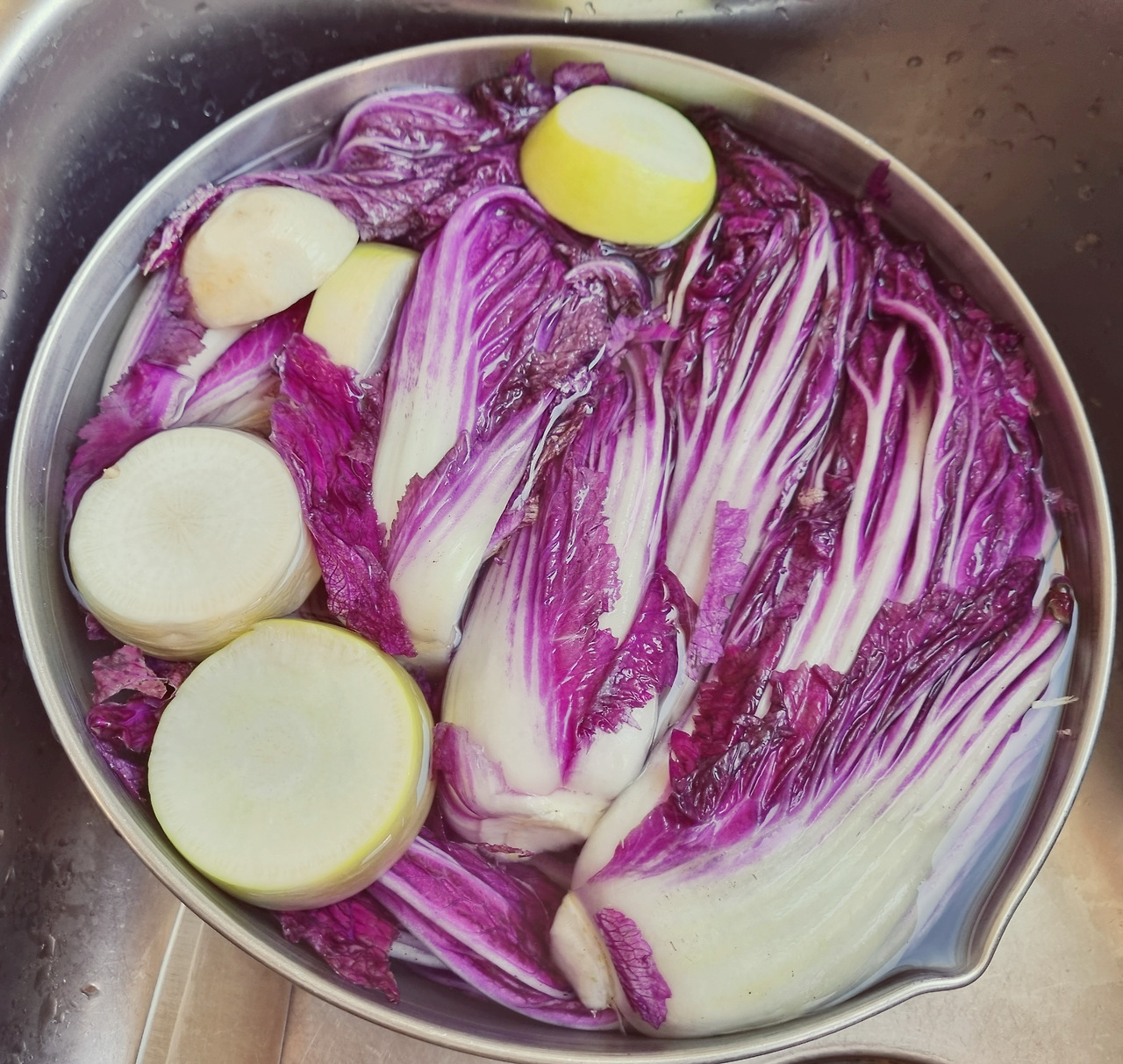 적배추라고 다를게 뭐 있겠는가. 굵은소금을 잎 켜켜이 뿌리고 소금물에 절이기 3시간째.