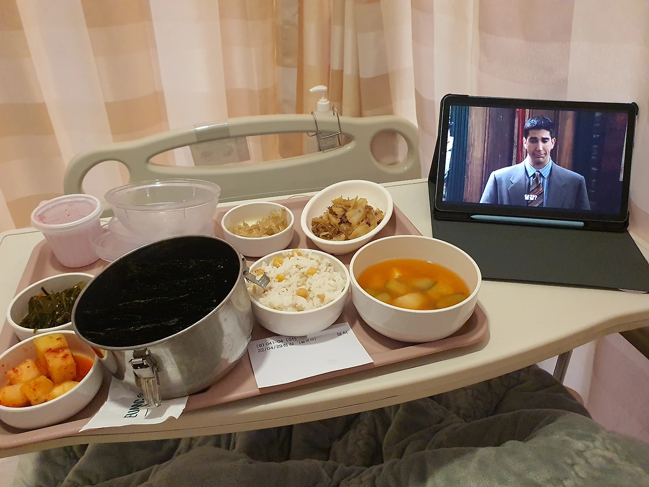 나는 일단 열심히 점심을 먹었다. 최근 먹성이 아주 좋아진 상태 그대로 입원했는데 맛은 없어도 배가 고프니 밥이 쑥쑥 들어갔다. 이따가 검사고 나발이고 먹어야 살지. 지난 입원 생활 때 혼자 밥을 먹는 식사 시간마다 급격히 우울해졌었던 경험을 했던 터라 매 끼니마다 일부러 시트콤을 틀어놓고 먹고 있다. 아무 생각 없이 볼 수 있는 빅뱅이론, 모던 패밀리 류의 시트콤을 매우 좋아하는데 이 두 드라마를 모두 다 봐 버려서, 최근에는 프렌즈를 보고 있다.