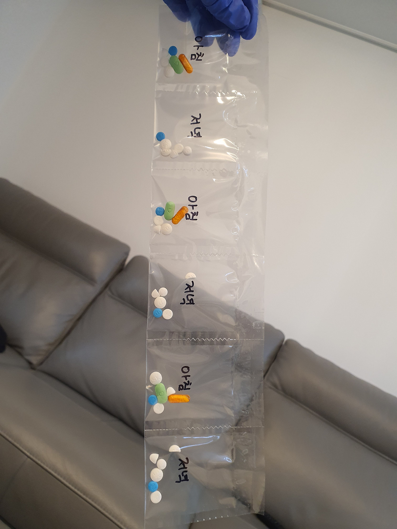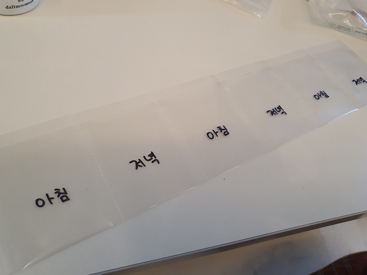 게다가 위에서도 말했듯이 약이 하도 많아서 매일 골라 먹는 게 여간 불편한 것이 아니었다. 하루 이틀 정도는 냉장고에 때마다 먹는 약 이름을 써붙여놓고 일일이 찾아 먹었지만, 곧 이 불편함과 약봉지에 대한 거부감을 없애기 위해 더 쉽게 먹을 방법을 찾기 시작했다. 수많은 검색 끝에 내가 스스로 약을 소분하기로 마음먹고 쿠팡에서 약 포지를 샀다. 약사님들이 쓰는 약봉투처럼 약을 넣어 밀봉하면 쉽게 뜯어먹을 수 있도록 되어있었다. 아래는 내가 약봉투를 만든 과정이다.