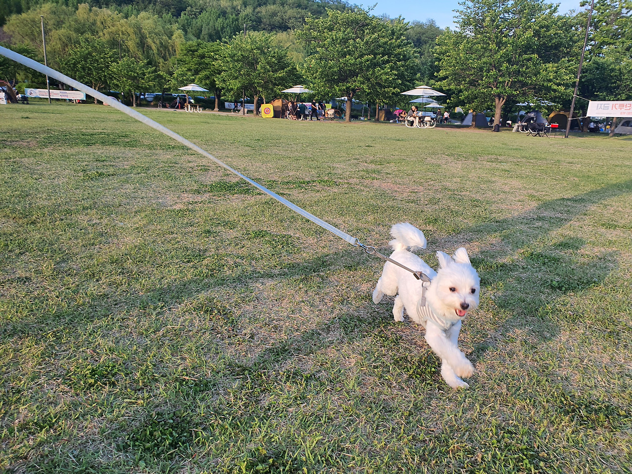 푸른 잔디밭을 뛰어노는 솜이를 보며 웃기도 하고,