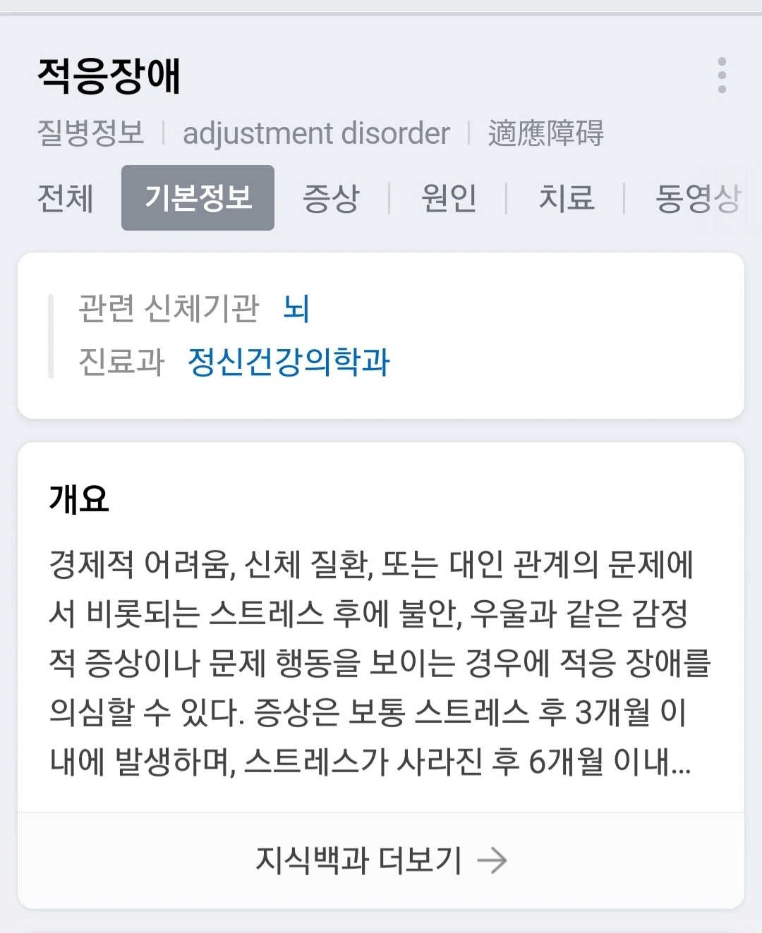나는 이러한 증상들을 진료받으며 혹시 약 때문에 감정이 더 드라마틱해진 건 아닐지 여쭤보았다. 입원 때부터 지금까지, 2주가 넘도록 신경안정제와 우울증약, 불안증약 등을 하루 5알 정도 복용중이었다. 그러나 의사 선생님은 고개를 내저으며 오히려 마음을 안정시켜주는 약이기 때문에 그럴 일은 없다고 하셨다. 결국 나는 뇌경색 완치 판정과 동시에 적응장애 진단을 받았다. 적응장애가 뭔지 나도 잘 몰라서 인터넷에 검색해봤다.