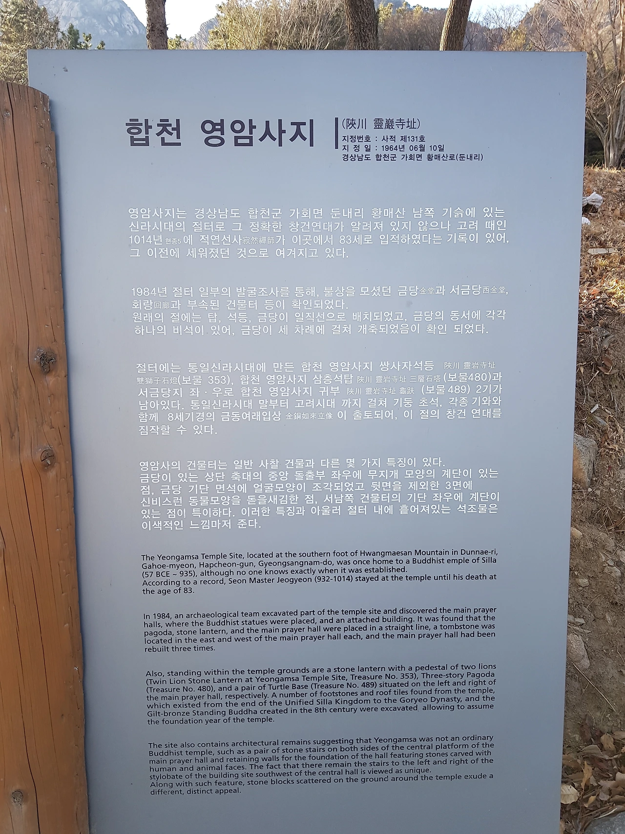 그리고 합천에 가면 가보고 싶었던 영암사지를 다녀왔습니다. 가는 길에 오도리 이팝나무를 만났습니다. 의도하고 찾아간 곳이 아니라 반가움이 두 배였습니다. 황매산 자락의 영암사지, 오래된 노거수를 만나고 쌍사자석등, 귀부를 만났습니다. 금당터에 서니 그곳의 기운이 온몸에 전해지는 것 같았습니다. 상쾌하고 맑은 겨울 공기에 기분도 상쾌, 경쾌해졌습니다.