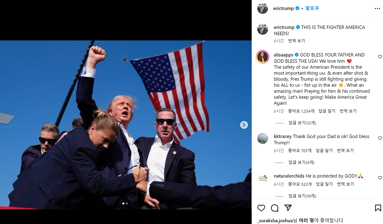 아들 에릭 트럼프는 사건 직후, 인스타그램에 아버지의 사진을 올렸다. 그리고 아래와 같이 작성했다.