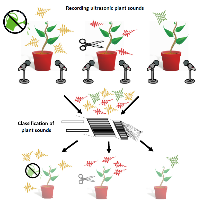 연구팀은 토마토와 담배로 외에도 밀, 옥수수, 포도나무 등 다른 식물을 활용해 동일한 실험을 반복했고, 각 식물마다 고유의 소리가 있으며 스트레스를 받으면 더 자주 소리를 낸다는 사실을 발견했어요. 이후 실험의 데이터를 활용해 식물의 소리를 구분할 수 있는 머신러닝 알고리즘을 만들었죠. 즉, 식물의 소리만 듣고도 식물의 품종을 구분할 수 있음은 물론이고 식물의 스트레스 원인까지도 알 수 있게 된 거예요.