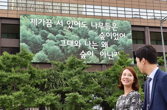 강은교 시인의 시와 타오루이쩡 씨의 디자인으로 가을옷을 갈아입은 광화문글판! 여러분도 센치해지기 좋은 가을, 혹시 응원과 위로가 필요하다면 교보생명 사옥에 부착된 광화문글판을 감상하며 용기를 얻어보는 건 어떨까?