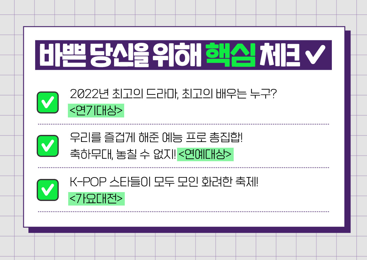 어느덧 2022년과 작별할 시간이 일주일 앞으로 다가왔다. 연말이면 한 해를 돌아보며 따수운 분위기가 오고 가곤 하는데, 여러분은 연말을 어떻게 보낼 계획인지 궁금하다. 친구들과 시끌벅적한 연말을 보내는 사람이 있는가 하면 필자처럼 폭신한 이불 속에서 가족들과 함께 TV를 보는 사람들도 있을 거다. 글쓴이는 특히 연말마다 각종 시상식들을 꼭 챙겨보는 편이다. 그래서 오늘은 시상식과 함께 한 해를 마무리하고 싶은 여러분을 위해 일정부터 라인업까지 모두 다 알려주겠다!