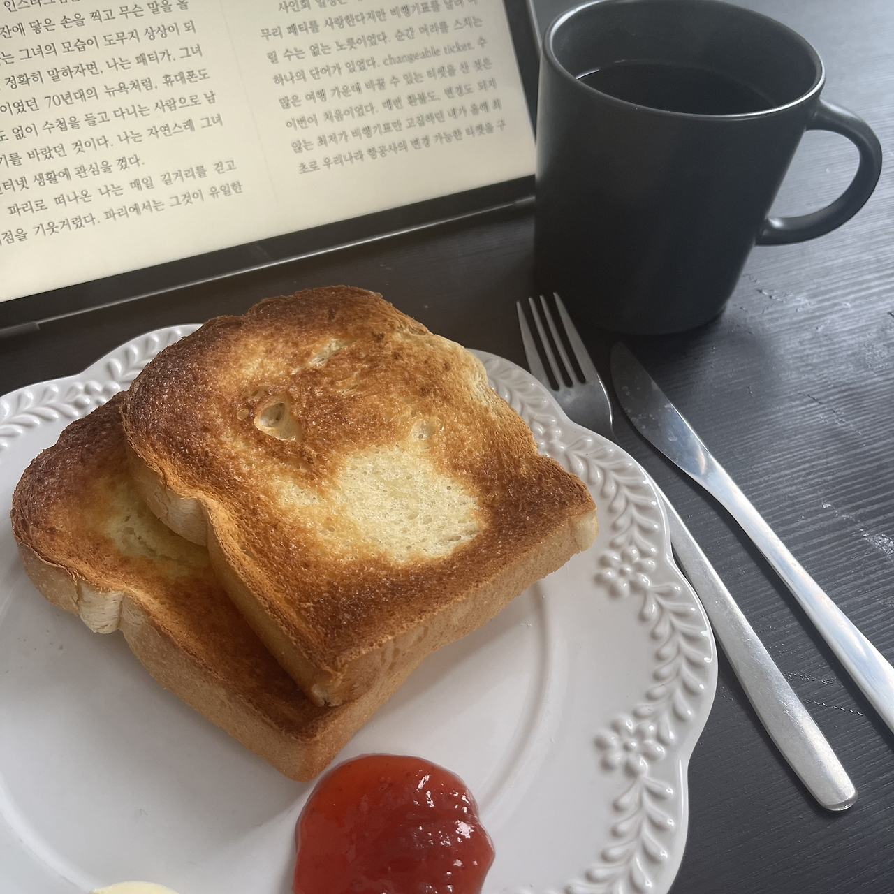 대형 마가린을 듬뿍 발라 촉촉한 식빵 두장과 커피. 조용한 음악과 좋아하는 책을 보며 아침을 먹으면