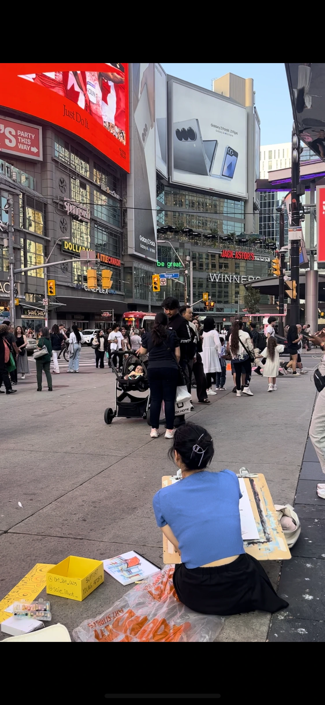 예를 들어, 난 최근에 토론토의 길바닥에 앉아 작은 팁 박스와 함께 라이브 드로잉을 했다.