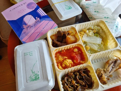 하루 세 번 나오는 도시락은 정말 돈 주고는 안 사 먹을 음식들이었으나 이렇게 먹다가는 병 걸릴 것 같다고 과일이나 요거트도 안 준다고 항의해준 몇몇 중국인들 덕분에 어느 날인가부터는 사과나 귤도 종종 제공되었다. 사과 알레르기가 있는 남편은 종종 본인 사과를 내 방문 앞으로 굴려주기도 했는데 처음엔 엉뚱한 곳에서 나뒹굴던 사과 굴리던 실력은 점점 향상되었다고...