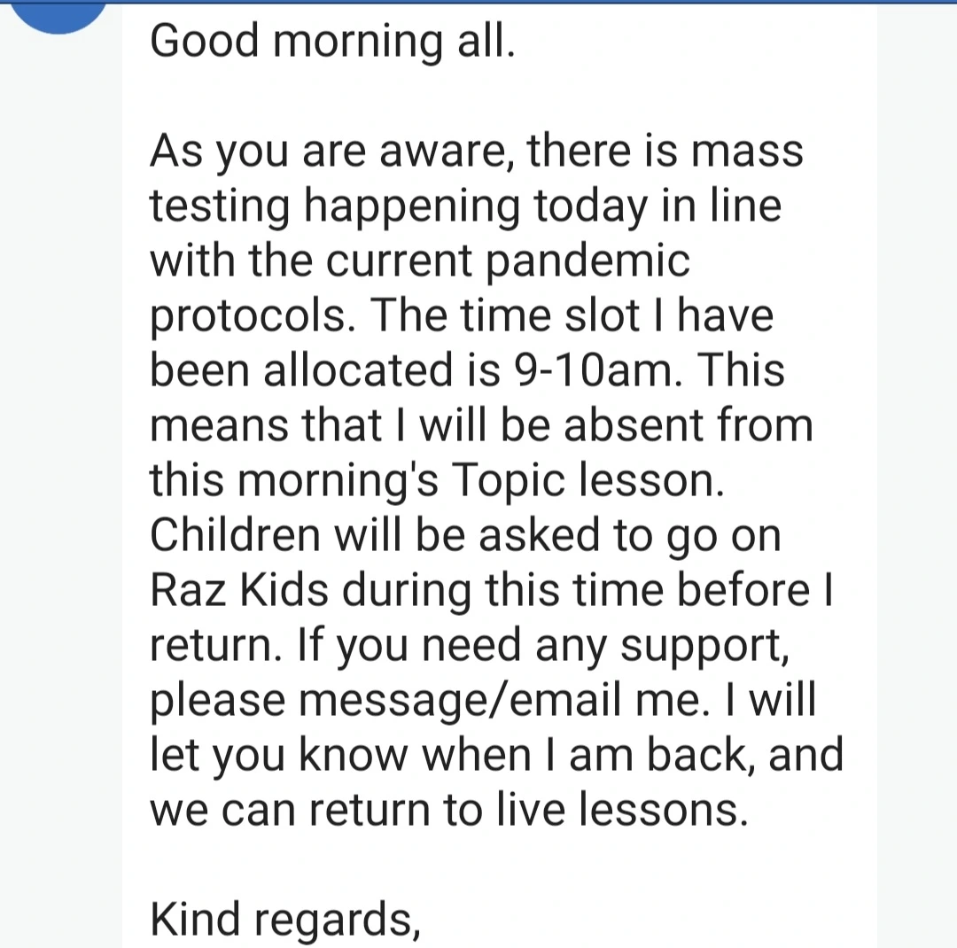 선생님의 코로나 검사로 인한 수업 불참 안내 메세지