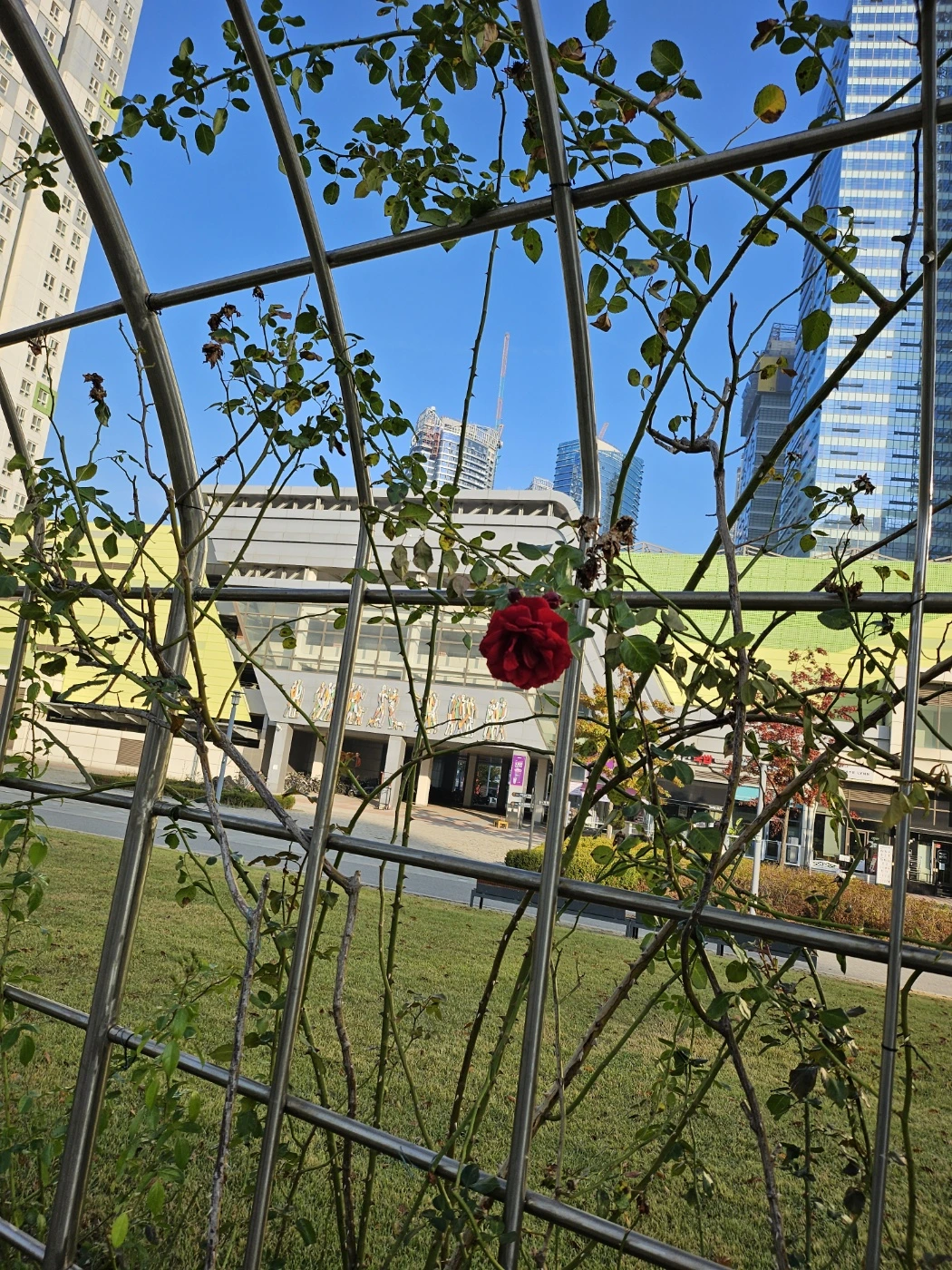 이미 화려하게 꽃을 피운 후, 가시와 잎만 남기고 있는 장미들 사이로 그동안 응축된 에너지로 뒤늦게나마 힘겹게 피어난 그 빨간 장미는 단연 돋보입니다.