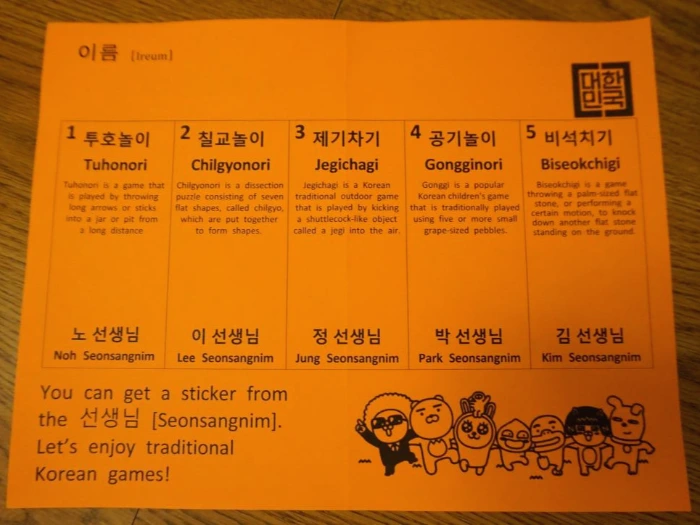 이번 정월대보름 맞이 한국어반 수업에서 해 볼 전통놀이로는 투호놀이, 칠교놀이, 제기차기, 공기놀이, 비석 치기, 이렇게 5가지를 준비했다. 종이접기 때와 마찬가지로 다섯 명의 선생님들의 다섯 가지 코너를 각기 맡도록 한 것이다. 모둠별로 그냥 체험의 시간을 가져도 좋겠지만 나는 여권 형식의 학습지를 만들어서 놀이 체험을 할 때마다 스티커를 받고 성취감을 얻을 수 있도록 했다.