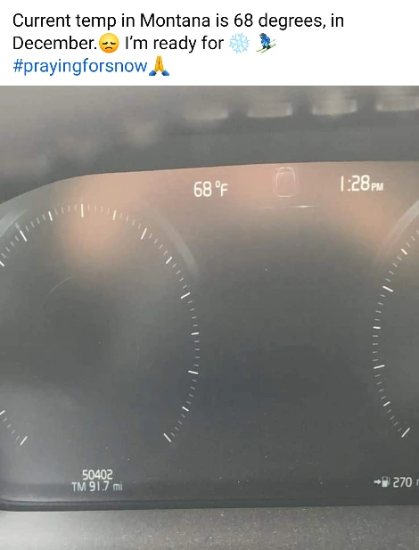 해가 갈수록 몬태나의 날씨가 심상치 않다. 몬태나에 눈이 오는 달은 일 년 열두 달 중에서 열 달이 넘을 정도로 눈이 많이 오고 안 올 때도 여기저기 쌓여 있는 눈을 쉽게 볼 수 있었다. 하지만 기후변화는 몬태나까지 영향을 미치고 있다. 점점 기온이 올라가고 있기 때문이다. 올해는 더 심각해졌다. 지난 12월 1일 몬태나 보즈만의 기온은 화씨 68도(섭씨 20도)로 따뜻하기까지 했다. 이렇게 푹한 12월은 처음이었다며 한 몬태나 친구는 눈이 오길 기원하는 글을 올리기도 했다.