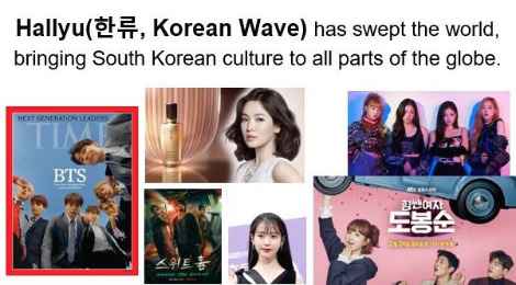 한국의 문화에 대한 내용은 한류에 대한 것으로 구성했다. 한국의 드라마(K-drama), 노래(K-pop), 화장품(K-beauty), 영화(K-movie)를 소개하고 최근 인기를 많이 끌고 있는 BTS와 오징어 게임에 대해서는 조금 더 자세히 이야기를 해 주었다. 그리고 던진 질문, How Korean Culture can be a source of soft power? 지난봄 수업 때는 이 내용을 다루지 못했지만 이번에는 학생들이 궁금해할 내용인 '높은 인기의 원동력'에 대해 설명해 주고 싶었다.